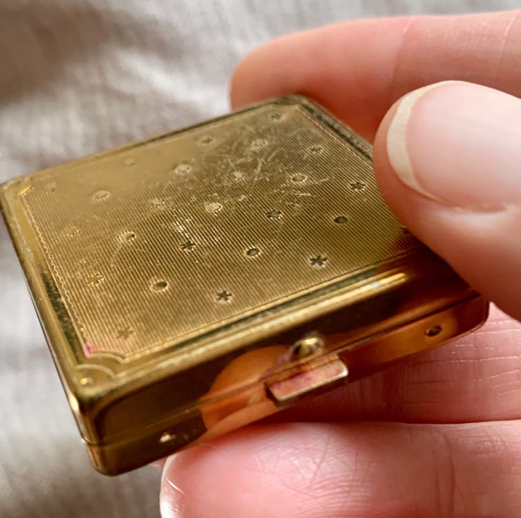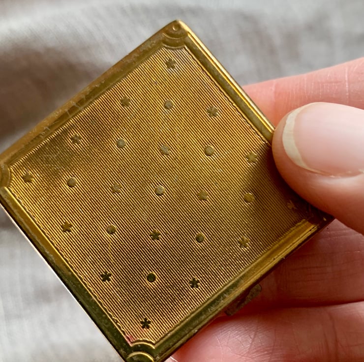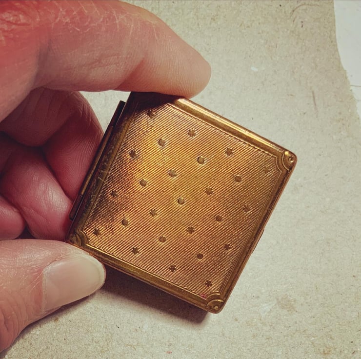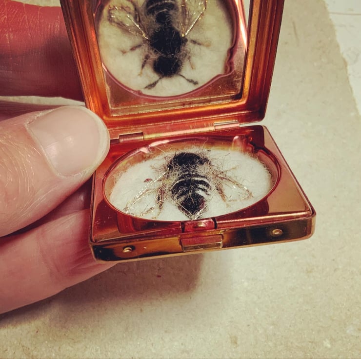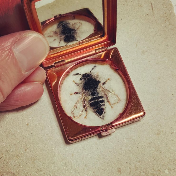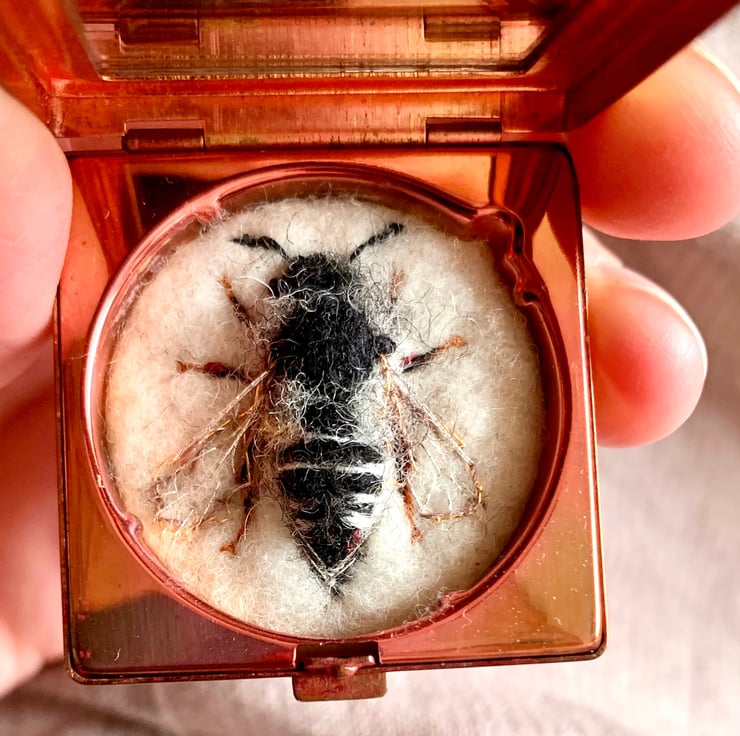 This is bee 172, Shiny-vented Sharp-tail Bee or Coelioxys inermis. The lovely small vintage powder compact is approximately 1.5” wide with a mirror in the lid. The bee is made of wool, vintage thread and kamibari gold and silk embroidery thread.