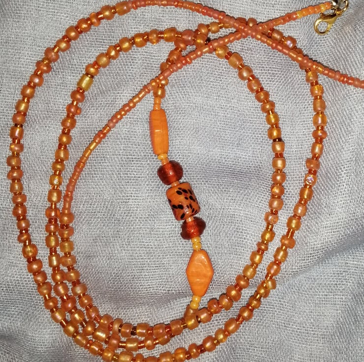 Glowing Joy Orange African Waist Beads made with orange glass beads on a Gold Chain.