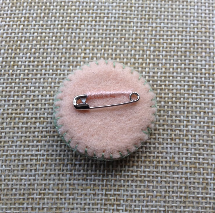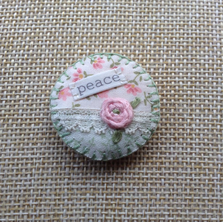 I have bonded two tiny print pieces of fabric onto a circle of felt, added some lace and embroidered a woven rose motif. I have printed "peace" onto fabric to make the little label which is sewn in place. The badge is backed with felt with blanket stitch around the edge. There is some felt sandwiched in the middle to help it keep its shape... A silver metal safety pin is firmly sewn on the back.