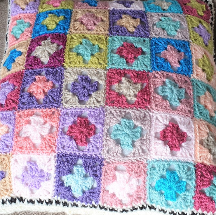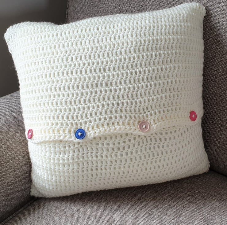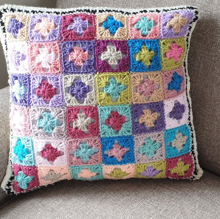 Handmade crochet cushion cover, small multi coloured squares hand stitched together with a black and cream border. A a plain treble stitch cream back to the cushion with rainbow buttons. I use acrylic yarn so the cover is washable, I recommend by hand or on a gentle washing machine cycle - pop the cover into a laundry bag/pillow case and dry flat.