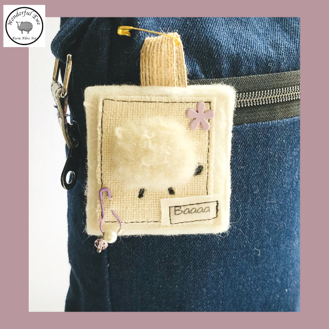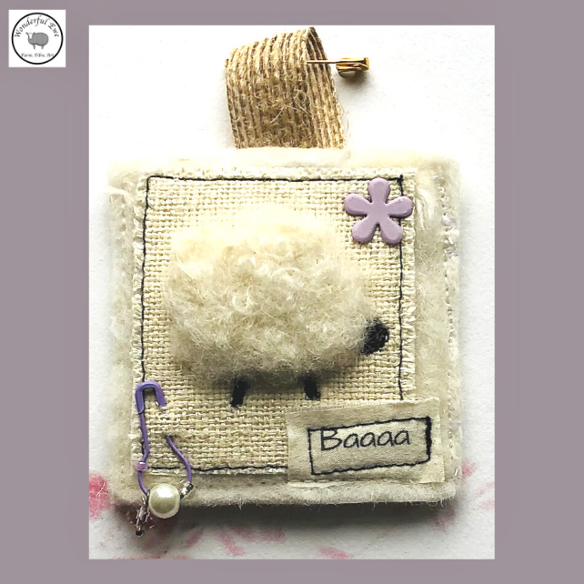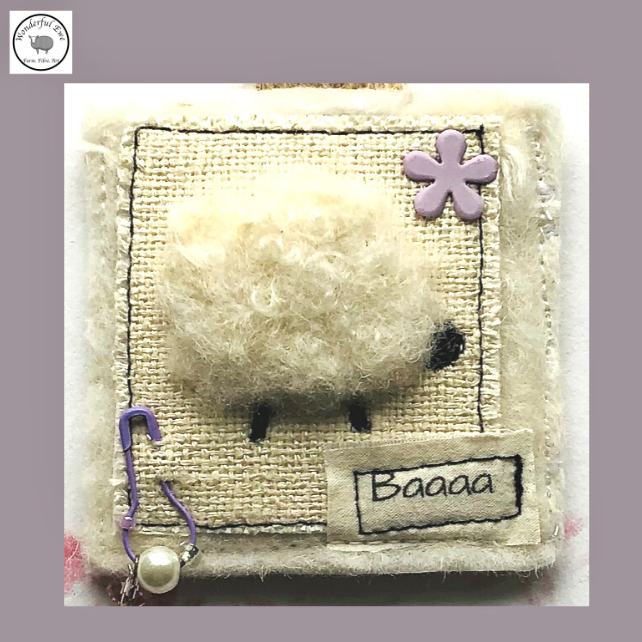 I made the base of this piece by wet felting wool, I then added a square of raw silk and needle felted a sheep on to it. The sheep head and legs are machine embroidered and there is a cute little 'Baaa' appliqué. I've also added a purple flower and pin with beads.