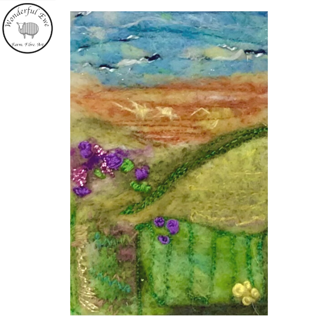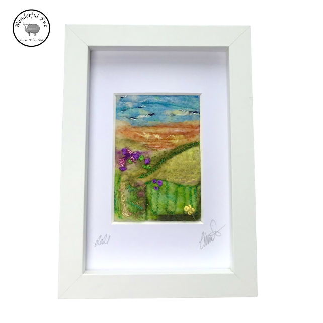 This miniature felt painting is full of texture and fibres. It has shades of blue, yellow and white wool for the sky and greens and browns for the fields.
