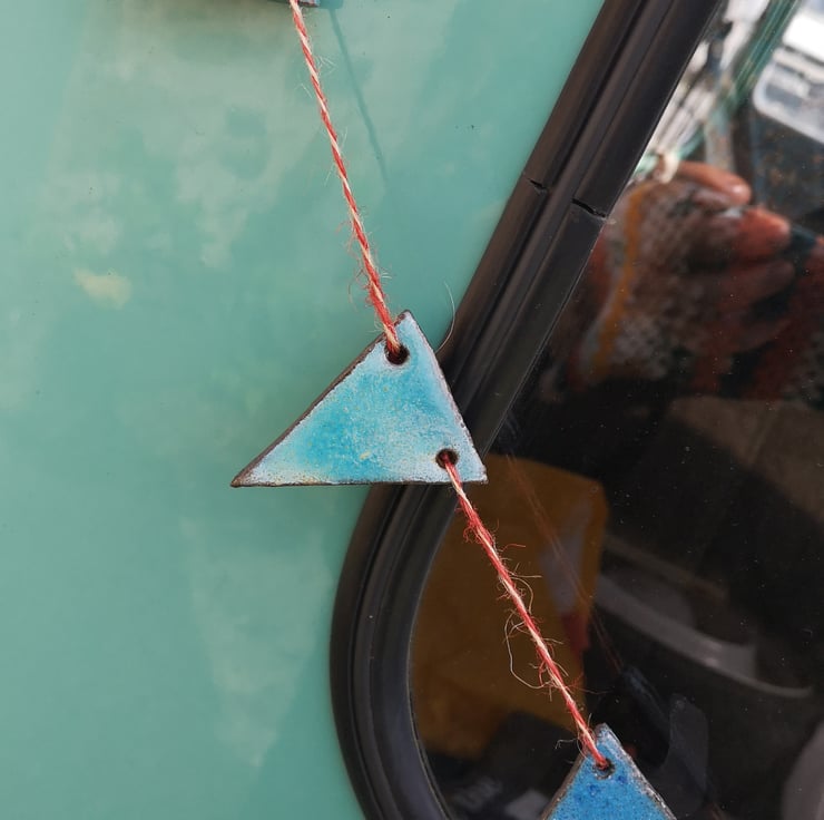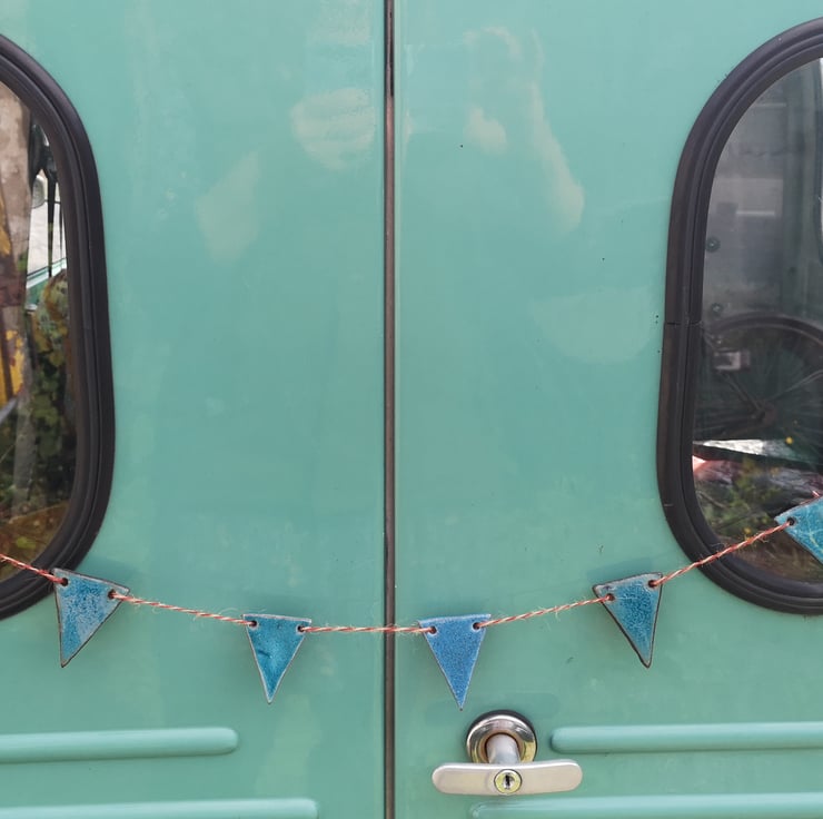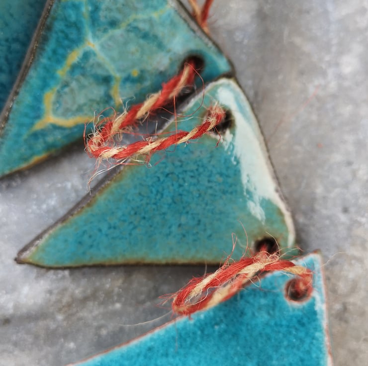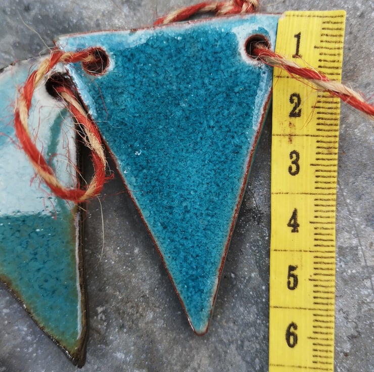 Each flag is handcut, fired then glazed and fired for a second time before being assembled. The mini bunting flags are about 5cm (aporx 2 inches) long.