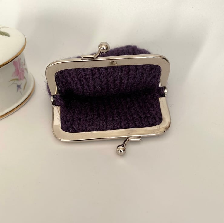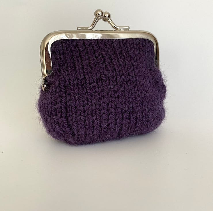 This cute small coin purse has been hand knitted in a lovely shade of purple, a popular colour choice. Ideal for keeping all your loose change, travel items, and lipstick. A handy little purse for all your essentials, and a perfect gift idea for friends and family.