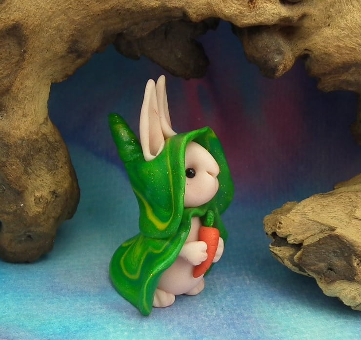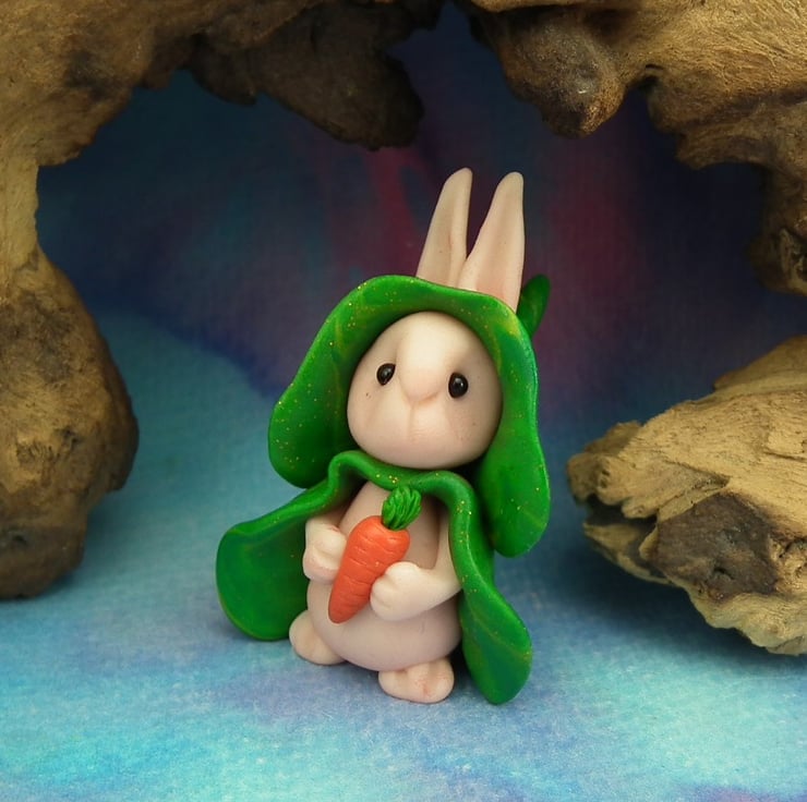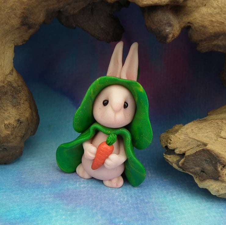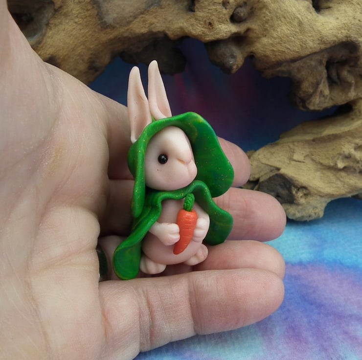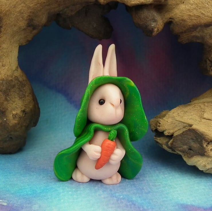 This is a 'one of a kind' creation; entirely handmade without the use of moulds here at my studio on the Sussex Coast. Modelled with Prosculpt polymers, painted with heat set paints before sealing with lacquer, Dewdrop has sparkling black onyx eyes and a delicious carrot. She is one and a half inches tall.