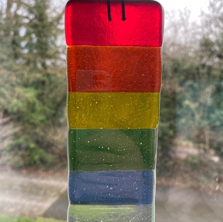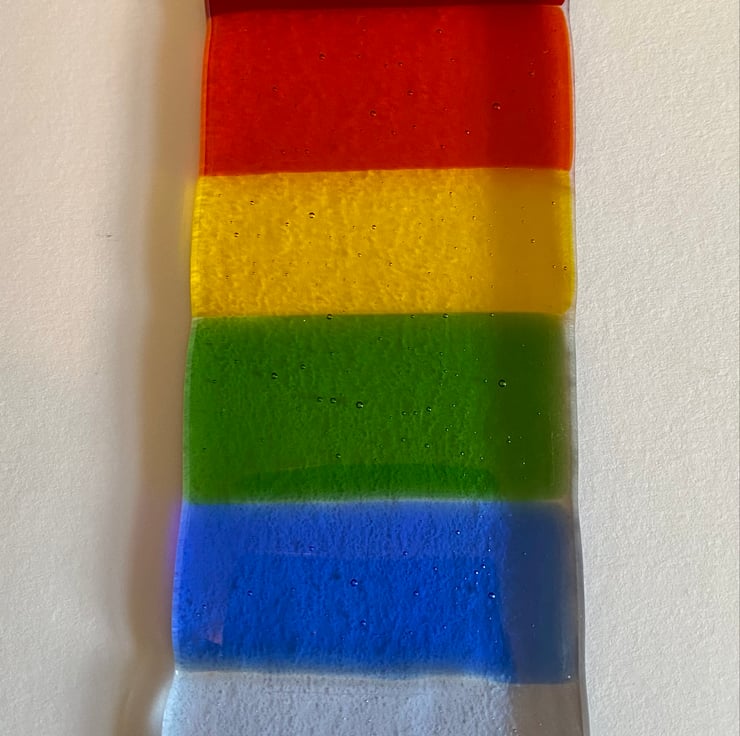 Bands of purple, blue, green, yellow, orange and red transparent glass are fused together to make this bright rainbow light-catcher.