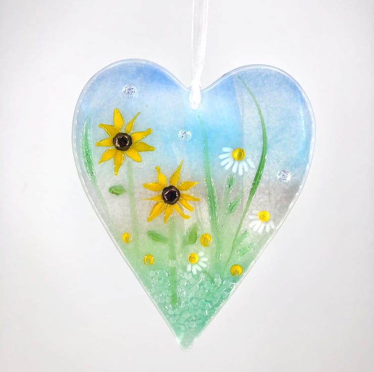 A pretty glass heart with a mix of sunflowers and daisies. This dainty piece has delicate flowers and foliage, some of which has been created using a lamp work torch with sparkly dichroic glass running throughout.