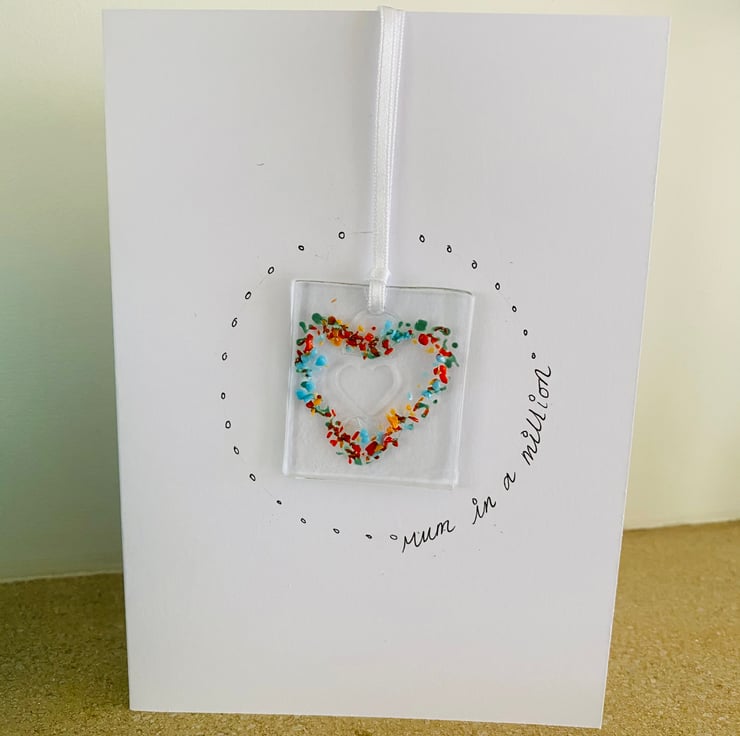 Mum in a million . A pretty heart hanging glass decoration keepsake with this Mother’s Day card.