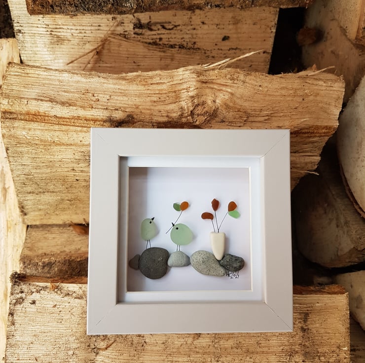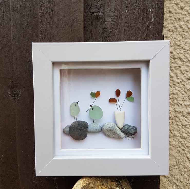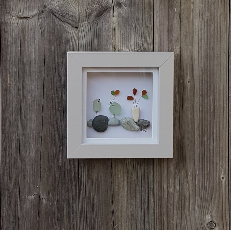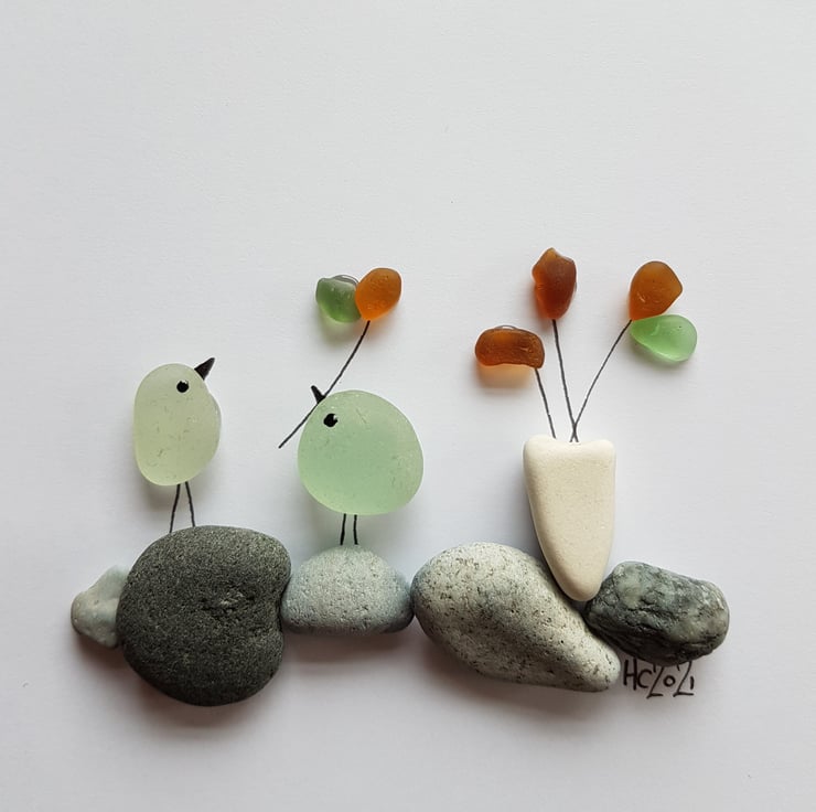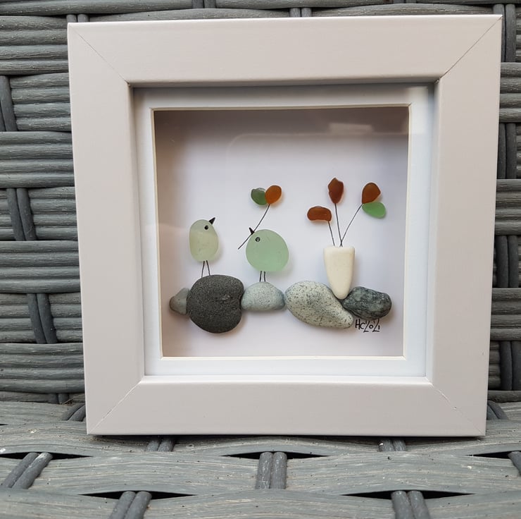A lovely picture of two love birds and flowers on pebbles. The picture contains yellow, green and aqua glass as well as contrasting grey stones and a smooth shaped white one made into a 'vase'. All treasures in this work been collected from Seaham in the North East of England.