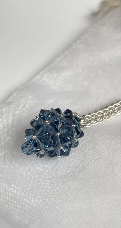 Individual denim blue European crystal bicones have been used to create this beautiful handmade shaped egg.