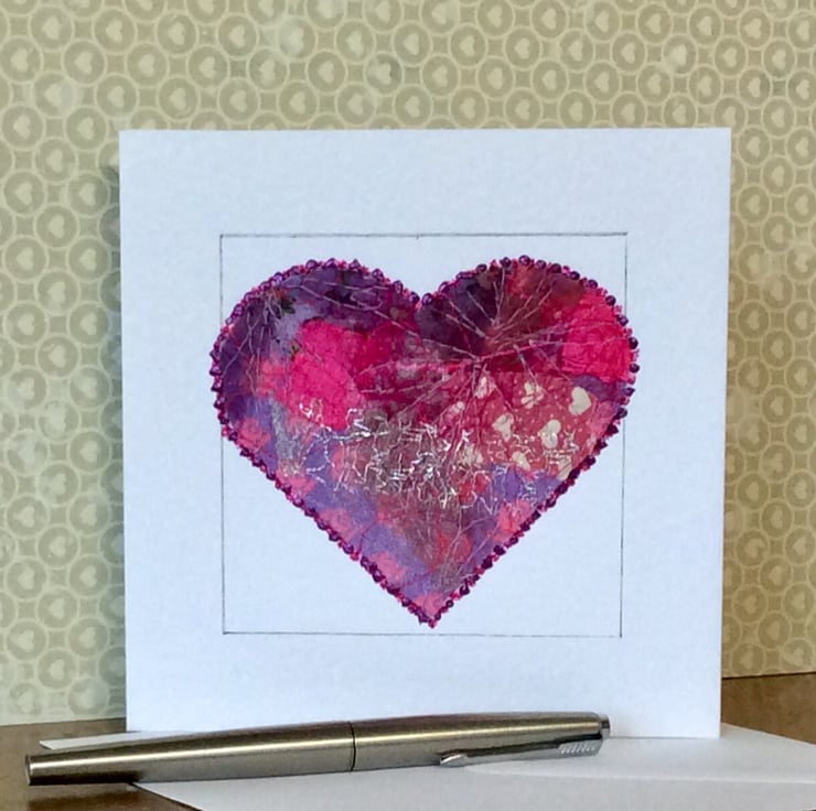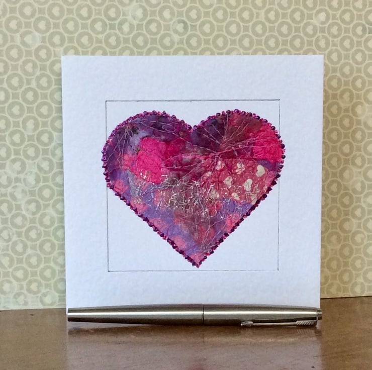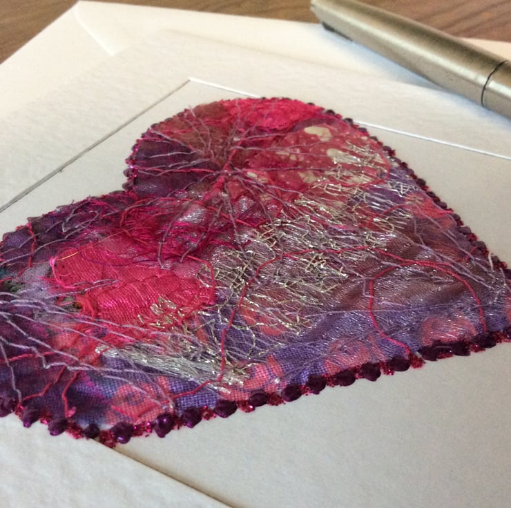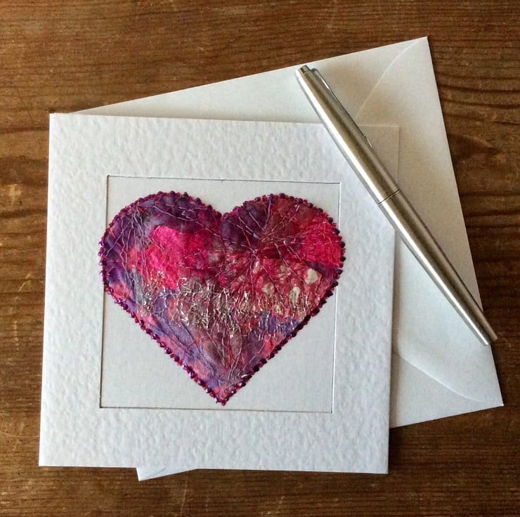 This embroidered heart has been made with my own handmade up-cycled fabric. This dramatic fabric contains silk, merino wool, threads, cottons and netting. It’s been enhanced with free motion embroidery and surrounded by small glitter and pearl dots. It’s perfect for a wedding, anniversary, engagement, Valentines or for someone very special. It is blank inside making it ideal for any occasion. This Hammer White Card measures 14.5 x 14.5cm, comes with an envelop and in a plastic cover for protection.