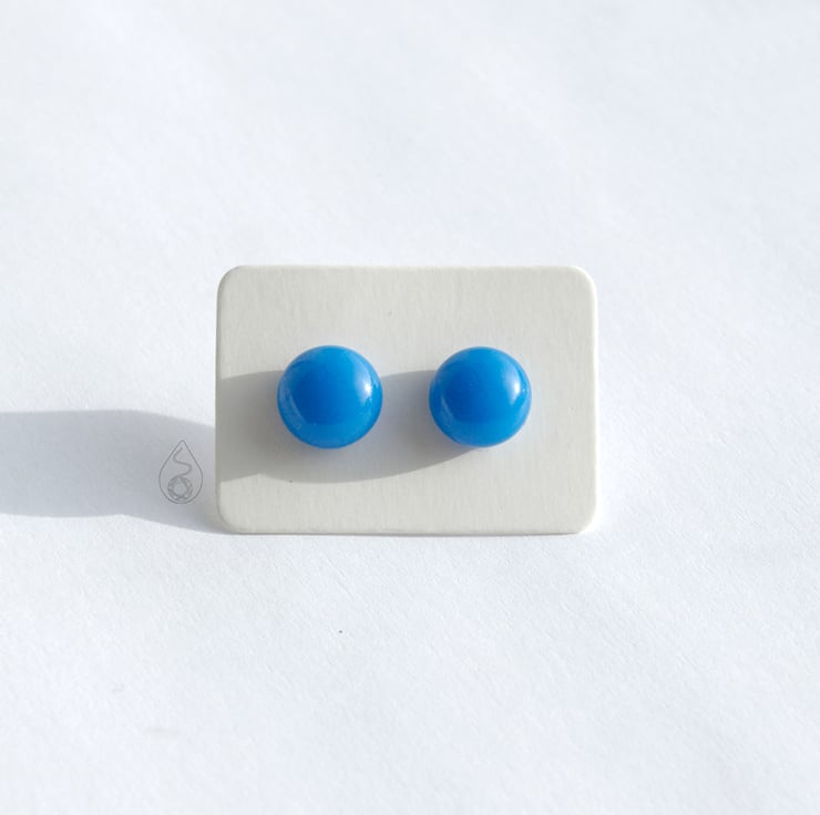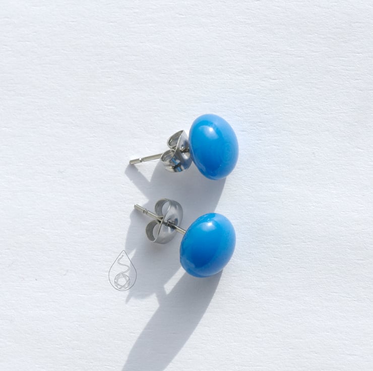 Small amounts of glass are fused at high temperatures in a kiln to create round droplets of glass. These are then securely attached to surgical steel earring posts with butterfly backs.