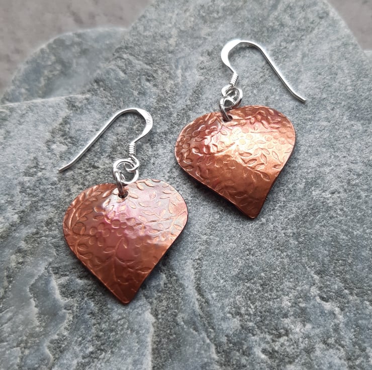 Heart shaped pieces of copper which have been hand cut from a sheet of copper have been patterned using a rolling mill with a flower and leaf design to give texture and are attached to sterling silver ear wires with sterling silver rings