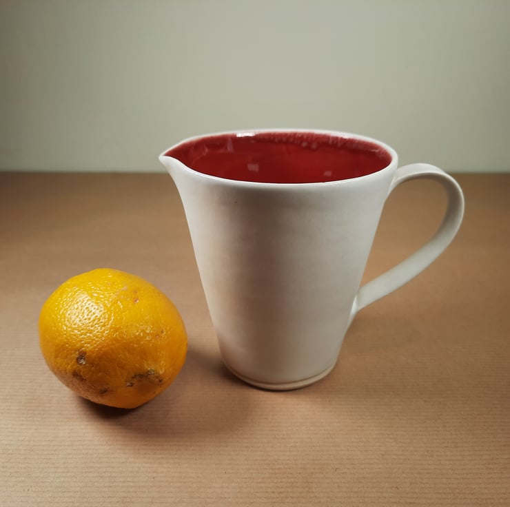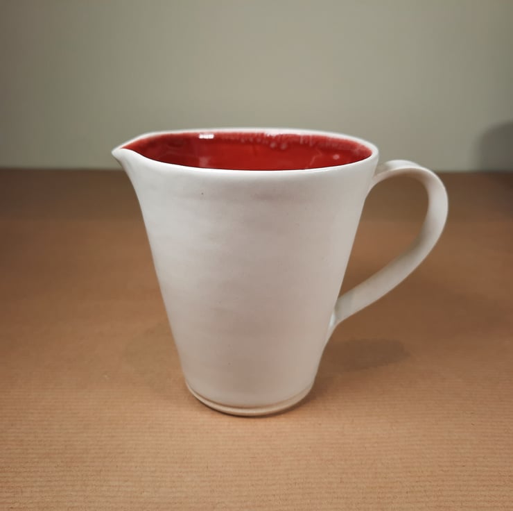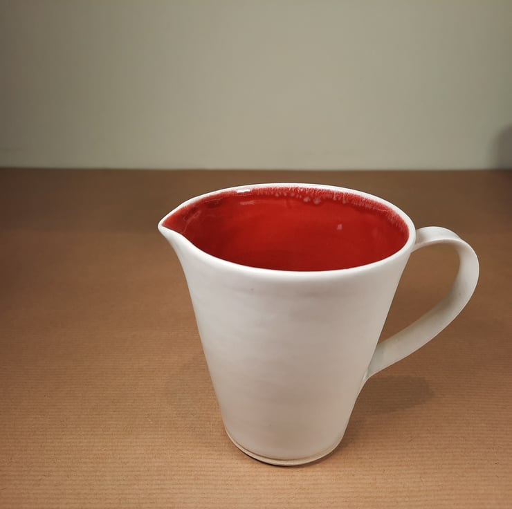 A hand thrown cream jug, holding approx half a pint. I have used a glossy ruby red glaze on the inside with a contrasting satin off white glaze on the outside. All clay and glazes I use are lead free and food safe.