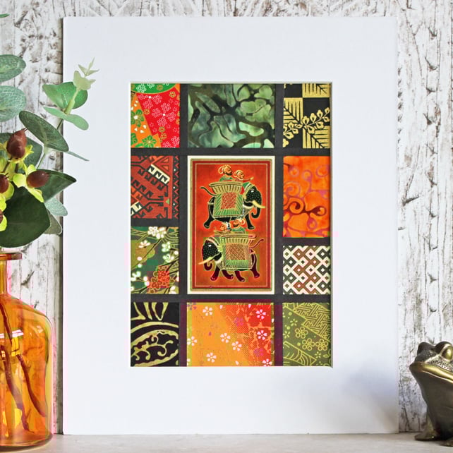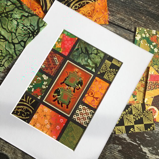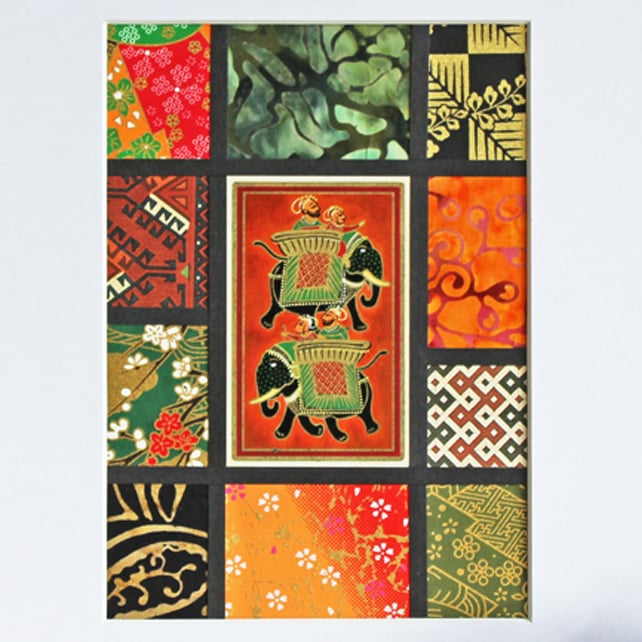 At the centre of the artwork is a pretty vintage playing card with a painting of Indian elephants. I've also used sections of Indonesian batik, decorative paper from old books and Japanese origami papers. There is metallic gold in the origami papers which catches the light and adds a bit of sparkle.
