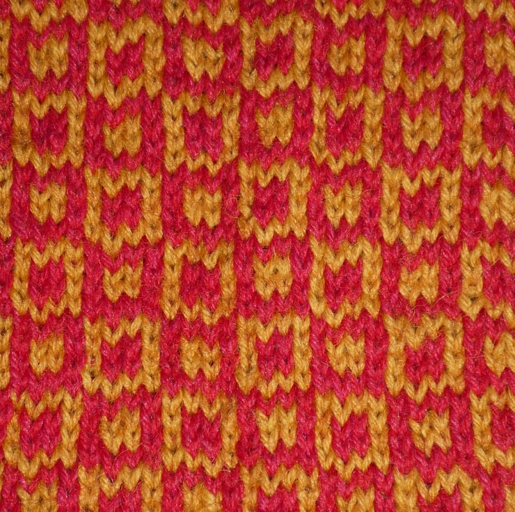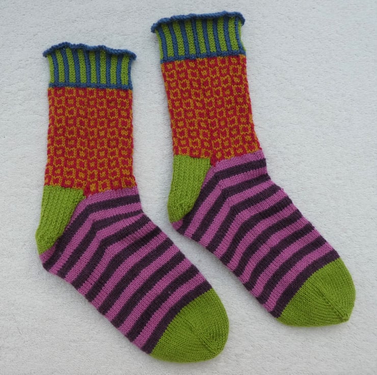 This is a pattern for socks that are knit in the round from the toe up, and can be made in 3 different foot width sizes. The toe is knit in a plain coloured yarn, with the foot of the sock in horizontal stripes. The heel is knit in a slip stitch pattern in a colour to match the toe, with the leg in a fair isle box stitch pattern. The sock is finished with a two colour alternating rib.