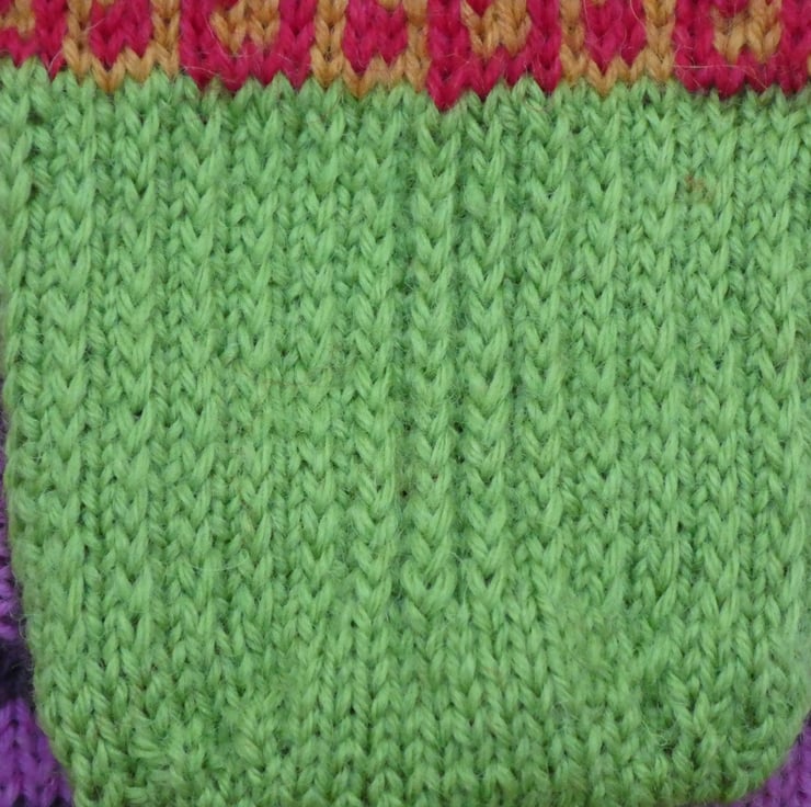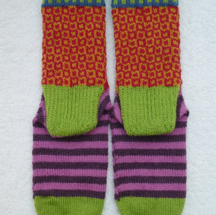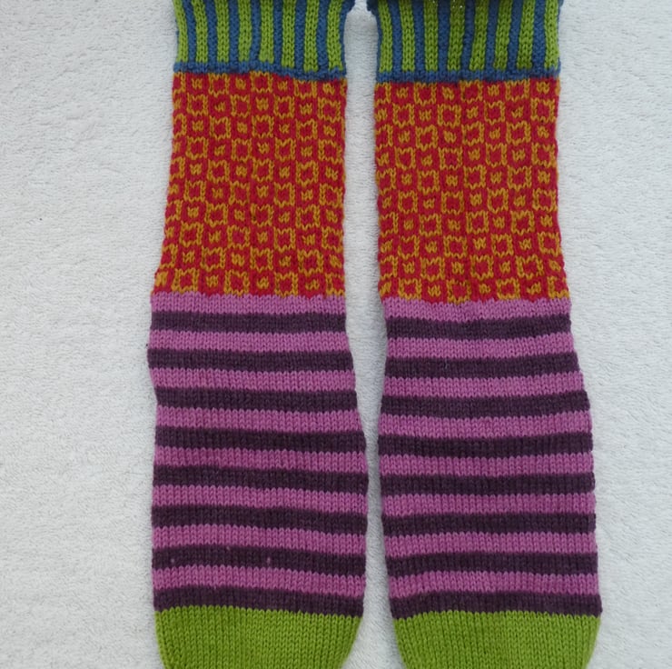 They are knit on 2.25mm DPN's and you will need green, blue, red, gold, pink and purple 4ply sock yarn. These socks have been knit in Drops Fabel 4ply sock yarn.