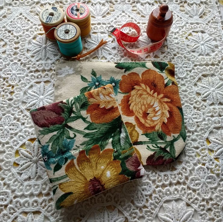 Made from time softened and re-purposed vintage furnishing fabric, this little notions pouch and needlecase set is the perfect addition to any crochet or knitting bag and will store an assortment of accessories and needles for darning or seaming as well as adding a little vintage aesthetic.