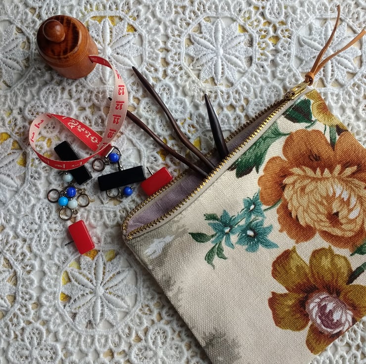 With an Autumn hued floral print for the main fabric, and then fully lined with a calamine linen, the pouch has rounded corners and measures approx 15.5 x13 cm (6 by 5 inches) and closes with a metal YKK soft gold coloured zip and will hold a variety of knitting and crochet notions and what nots, A piece of vintage leather thonging is on the zipper, this can be removed if required.