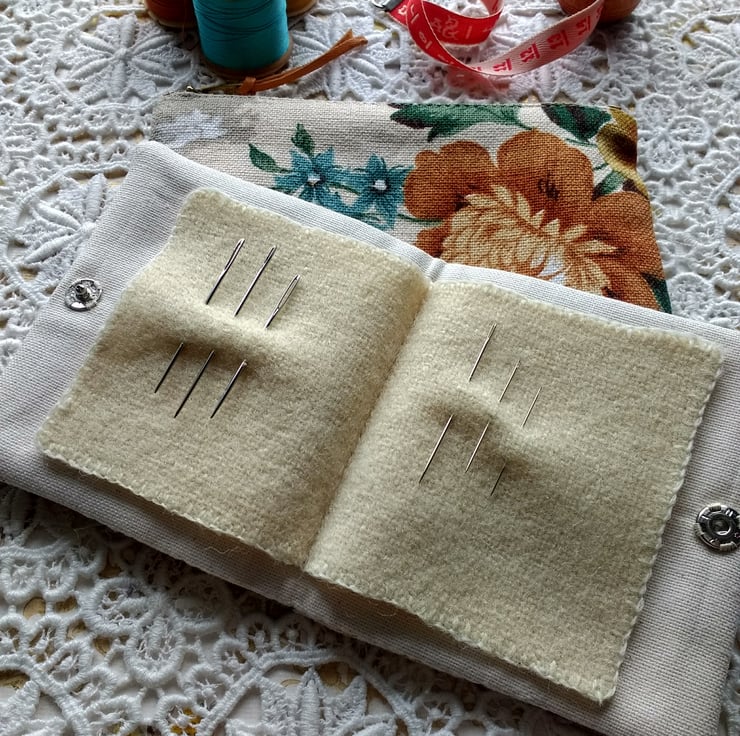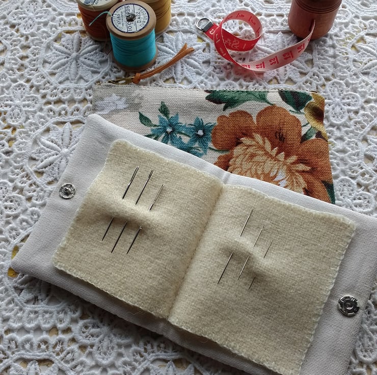 Between the outer and lining fabric is a piece of fleece made from natural fibres so the needlecase is nice and plump. Needles can also be pinned to the lining, the layer of fleece will help prevent them poking through to the front and is kept closed with a pair of hand sewn vintage snap fasteners.