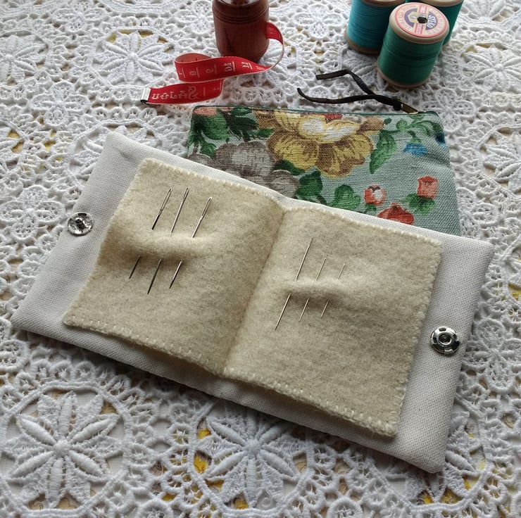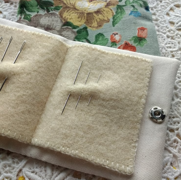 Between the outer and lining fabric is a piece of fleece made from natural fibres so the needlecase is nice and plump. Needles can also be pinned to the lining, the layer of fleece will help prevent them poking through to the front and is kept closed with a pair of hand sewn vintage snap fasteners.