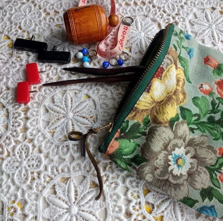 With a floral print for the main fabric, and then fully lined with green cloth, the pouch has rounded corners and measures approx 13.5 x 11.5 cm (5.5 x 4.5 inches) and closes with a vintage gold coloured zip and will hold a variety of knitting and crochet notions and what nots, A piece of vintage leather thonging is on the zipper, this can be removed if required.