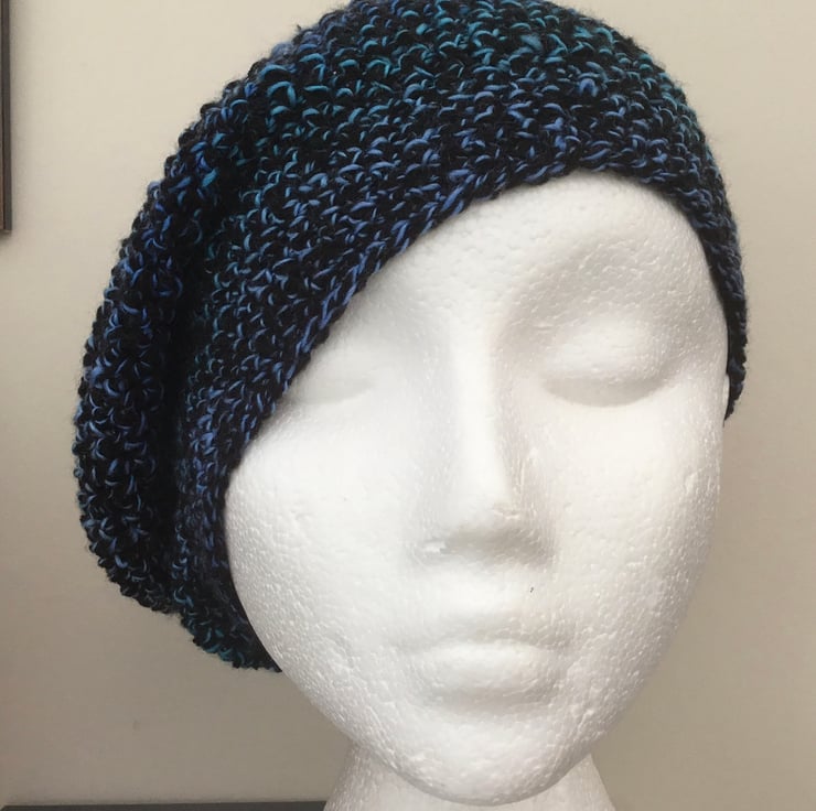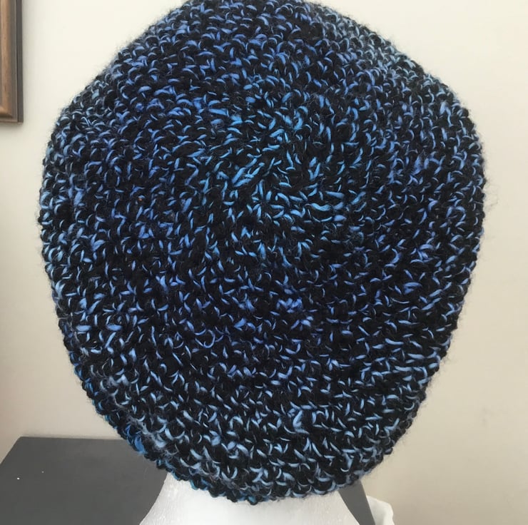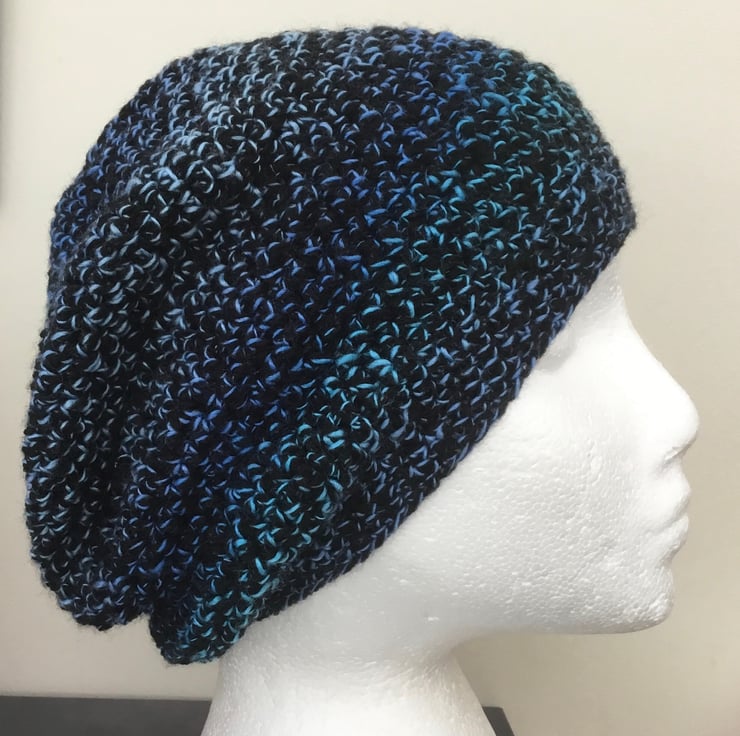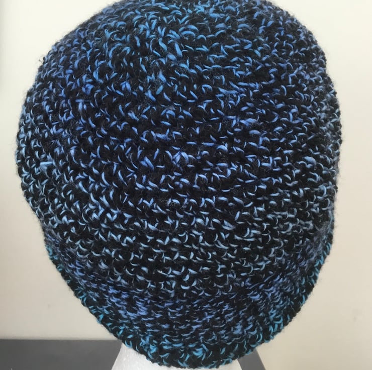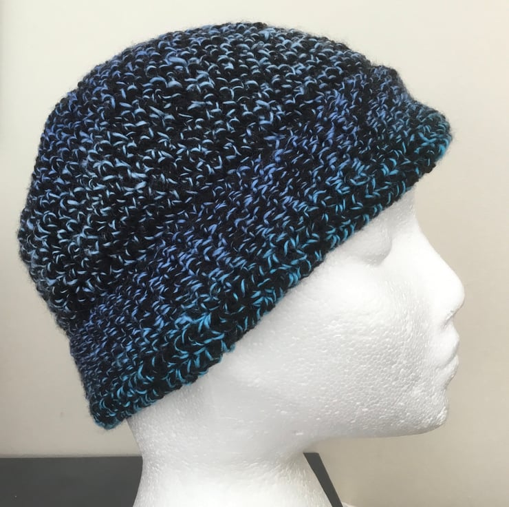 The variegated black, navy, royal blue and blue green yarn for this crocheted hat is wonderfully soft and would be equally wearable by a lady or a gent.