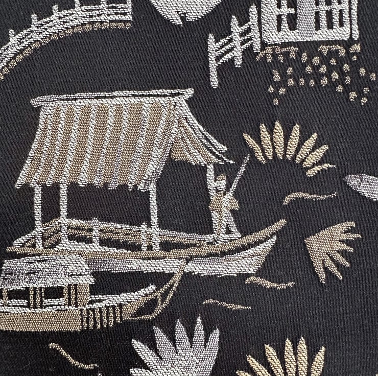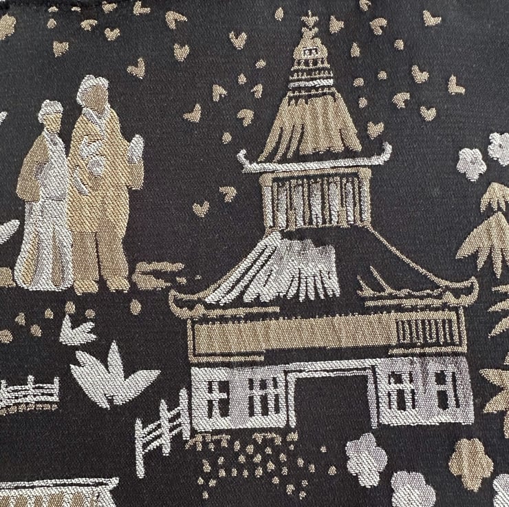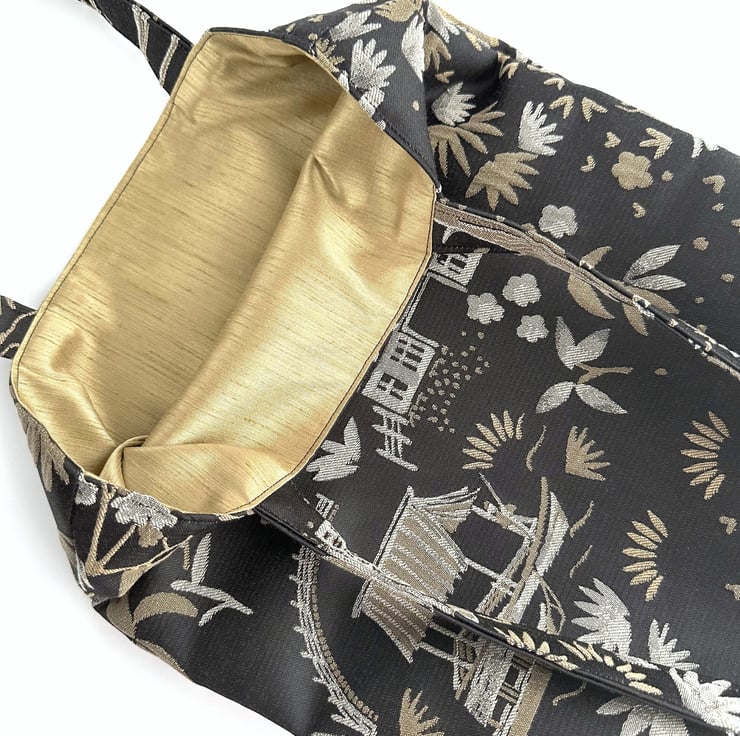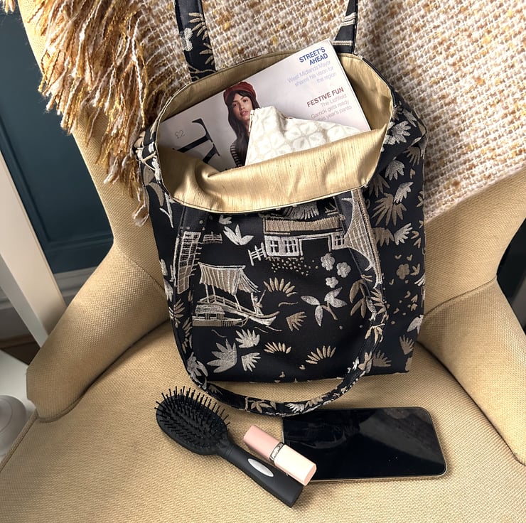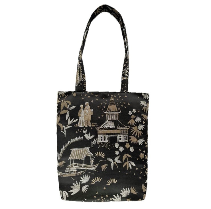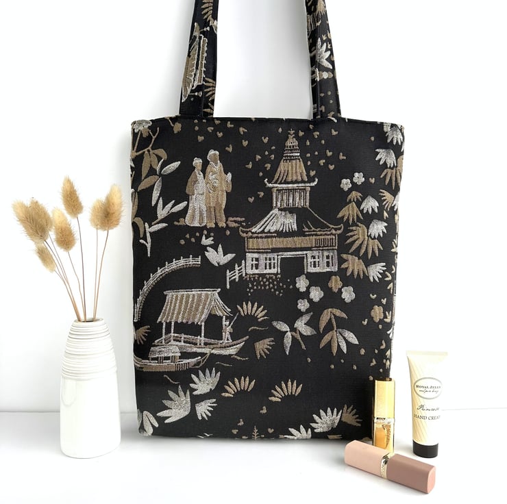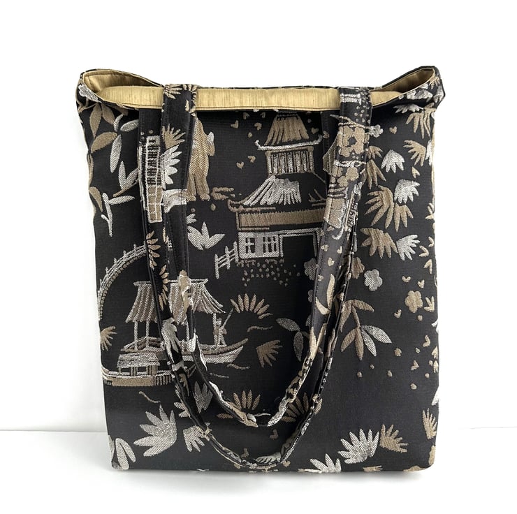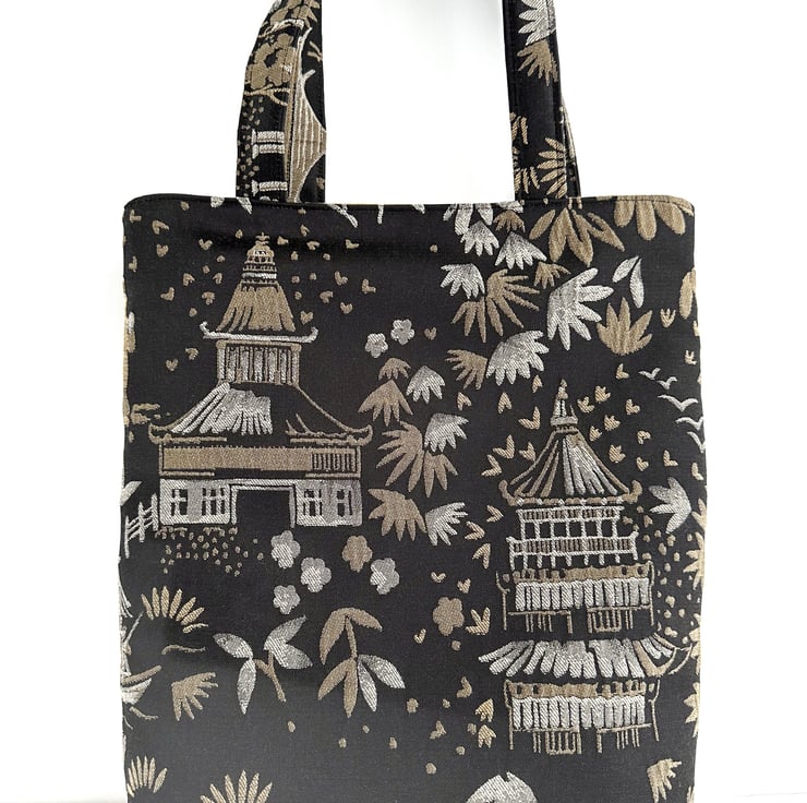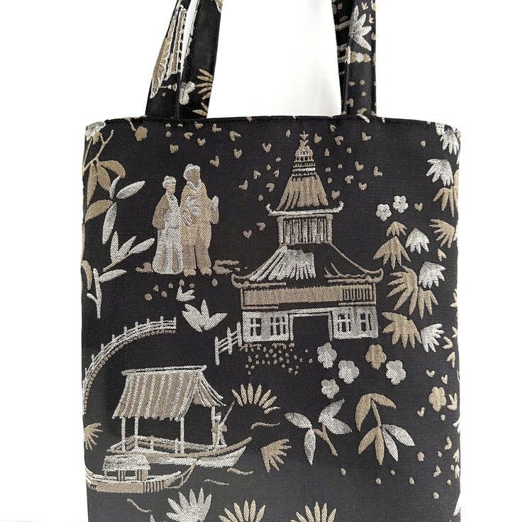 A luxurious Oriental tote bag with a pagoda gardens pattern. The bag is made from a luxurious jacquard fabric in black with a woven pattern in beige and cream. The pattern features Oriental illustrations, including pagodas, traditional boats, flowers and foliage, and figures in traditional Oriental dress. The black background has a slight sheen. The bag is lined with beige fabric with a woven geometric pattern of shiny cream lines. The lining co-ordinates beautifully with the outer fabric.