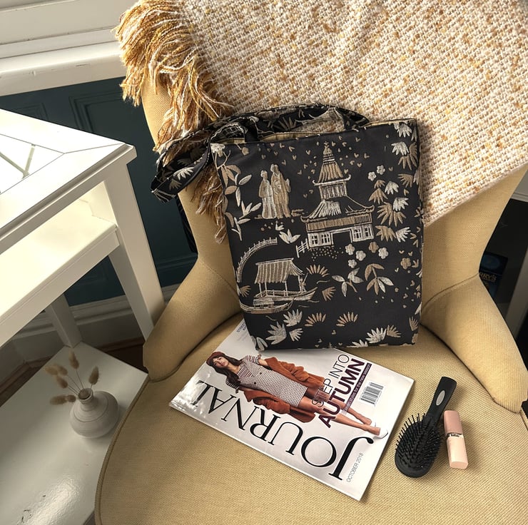 This lovely Oriental tote bag could be used as a handbag or small shopping bag. With its luxurious fabric and beautifully elegant Oriental pattern, it would be perfect for a special occasion or would make a lovely gift.