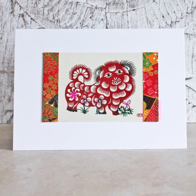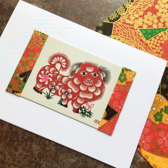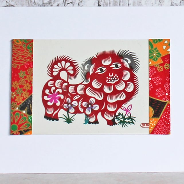 This pretty handmade card features a beautiful paper cut of a Chinese dog and flowers. The colourful origami paper at the sides has metallic gold in it which adds a lovely bit of sparkle.