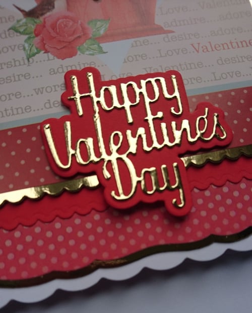 The sentiment has been hand cut and gold foiled and says "Happy Valentine's Day" and the 3D love hearts are also hand cut and gold foiled.