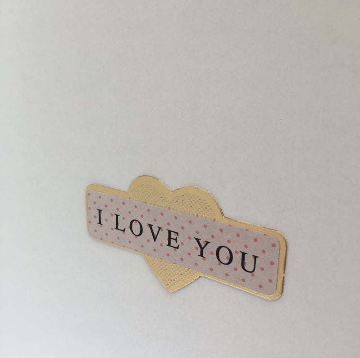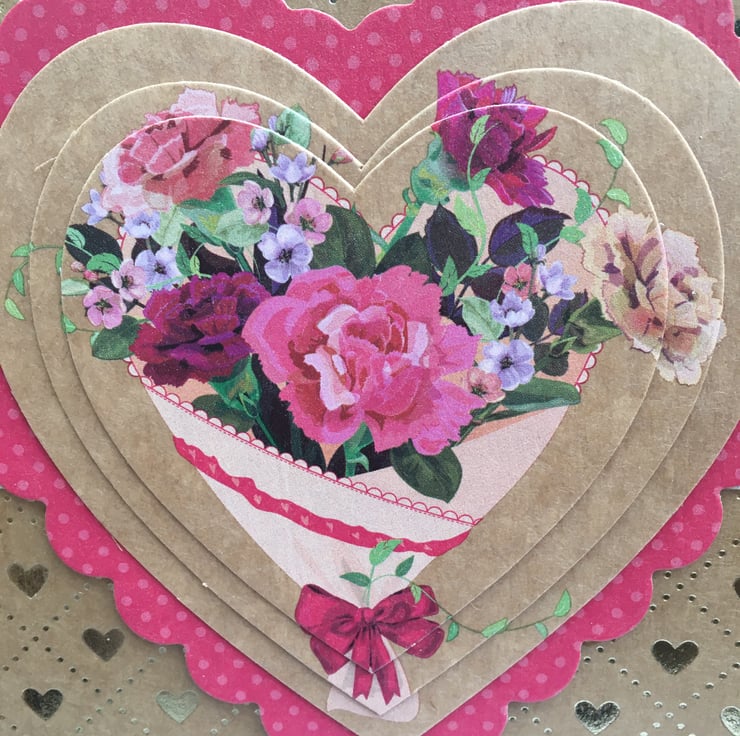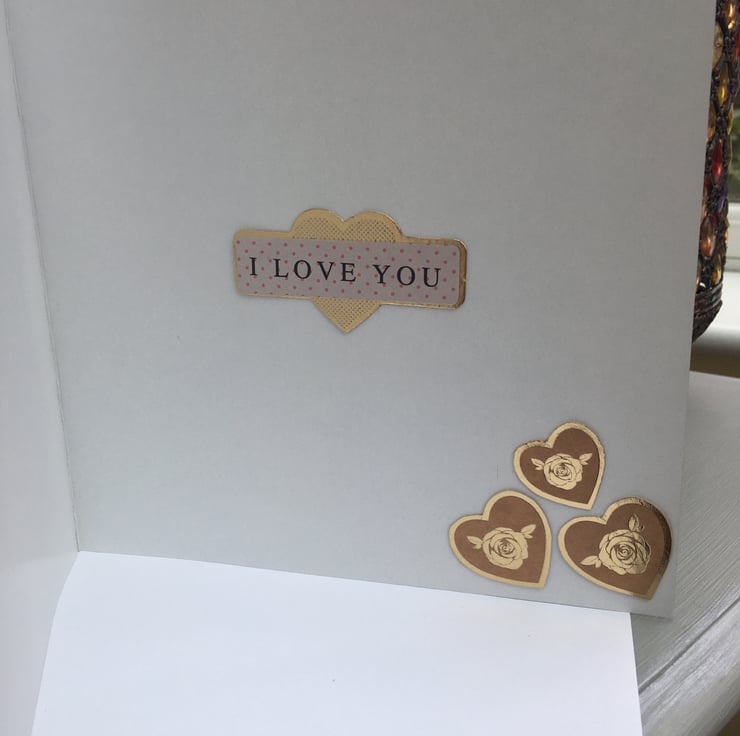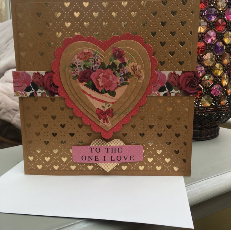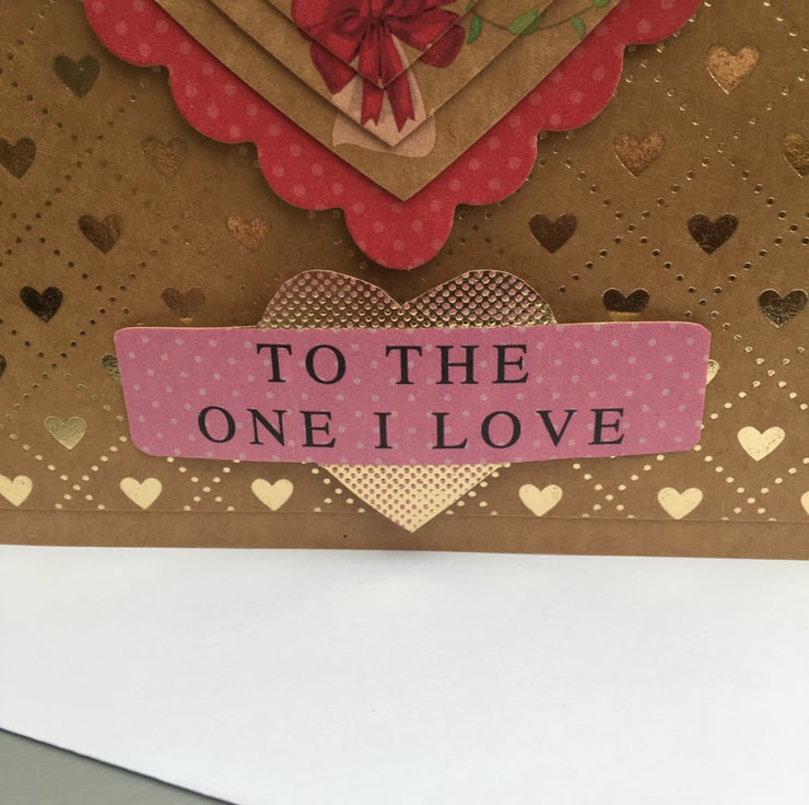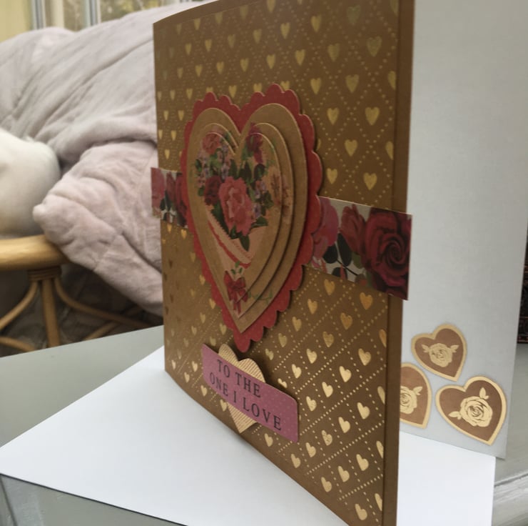 An unusual but very feminine card. This 8x8inch card is topped with a matching gold foiled printed sheet with a checkerboard design of hearts. This shows off the main design, a large scalloped heart in pink with a pyramage heart design on top. The hearts are decorated with flowers and ribbon designs. Under the heart there is a strip of rose printed matching card. The design is finished wit the greeting To the one I love on a pink banner with a gold heart behind. Inside the card is the greeting I love you on spotty card with a gold heart behind. 3 gold hearts finish the design. A perfect card for a Valentine but could be used for other occations, engagement, birthday, anniversary to name but a few.