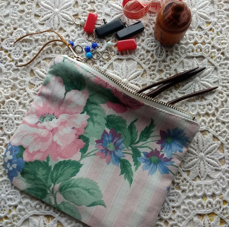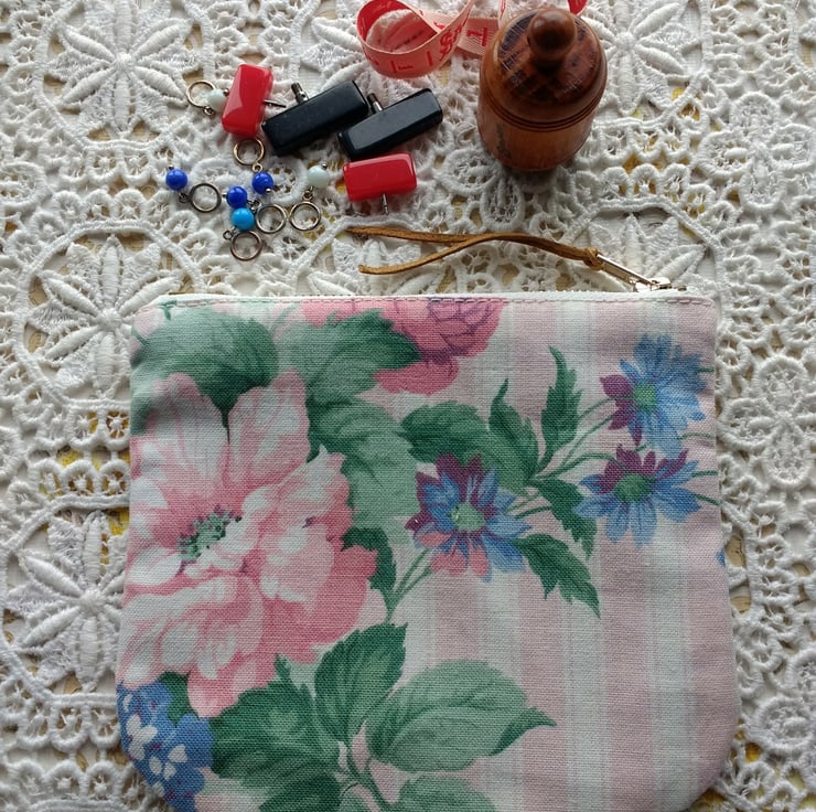 The main fabric is a floral print on an icecream pink and cream striped background, and then is fully lined with a calamine linen, the pouch has rounded corners and measures approx 15.5 x 13 cm (6.25 x 5 inches) and closes with a gold coloured metal ykk zip. The pouch will comfortably hold a variety of knitting and crochet notions and what nots, A piece of vintage leather thonging is threaded through the zip puller, this can be removed before posting if required.