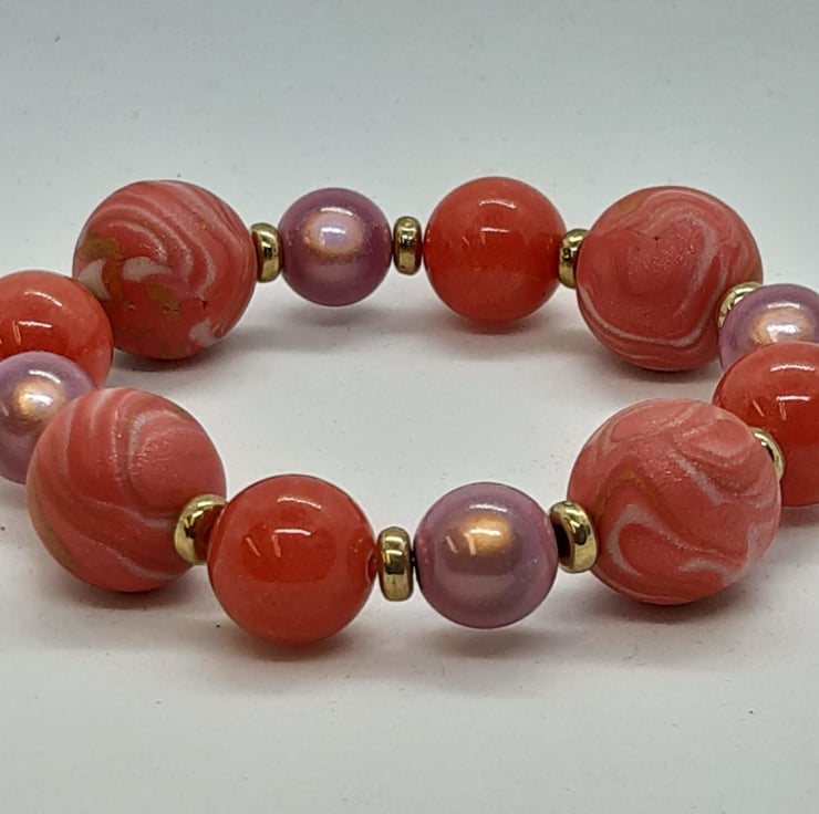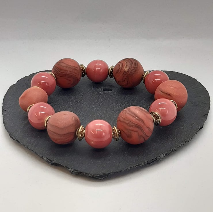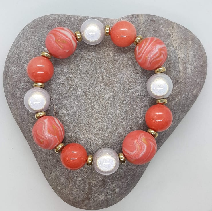 This bracelet is handmade with a mixture of coral/salmon pink and cream polymer clay interspersed with 14mm coral glass round beads and14mm grey miracle beads with gold spacer beads to complete the look.