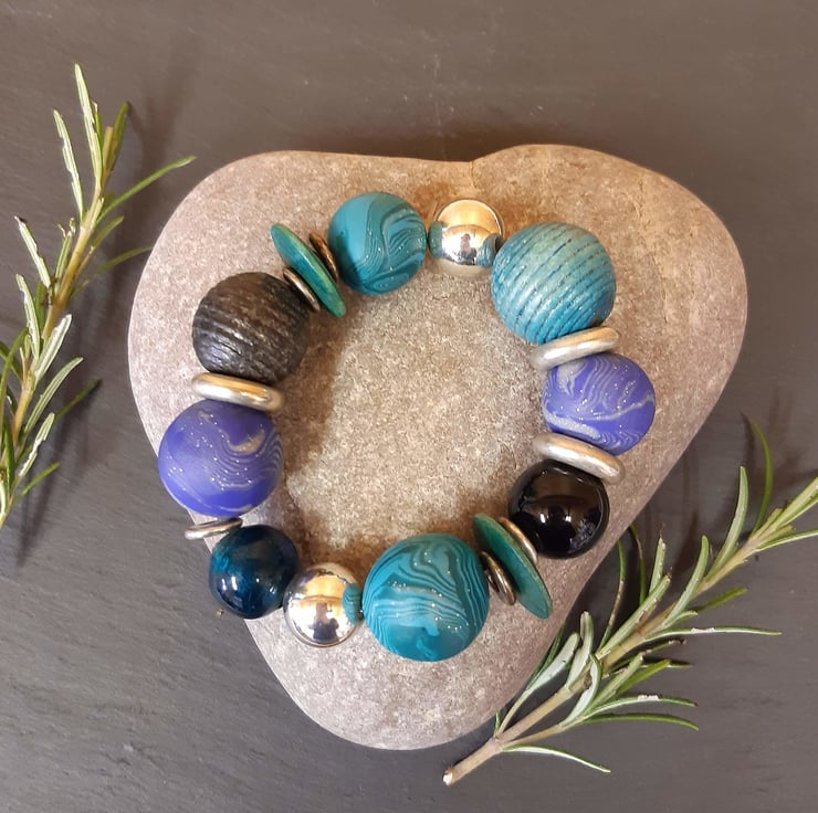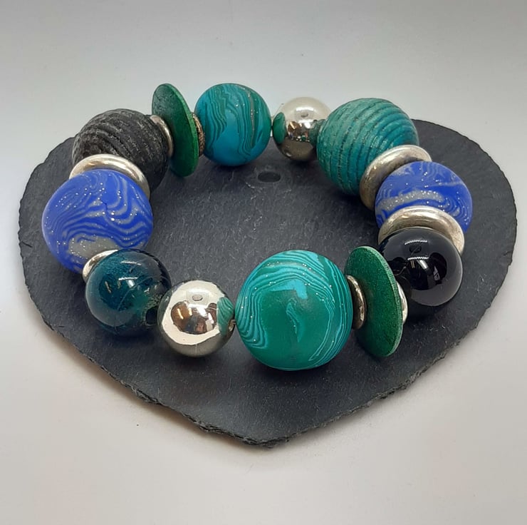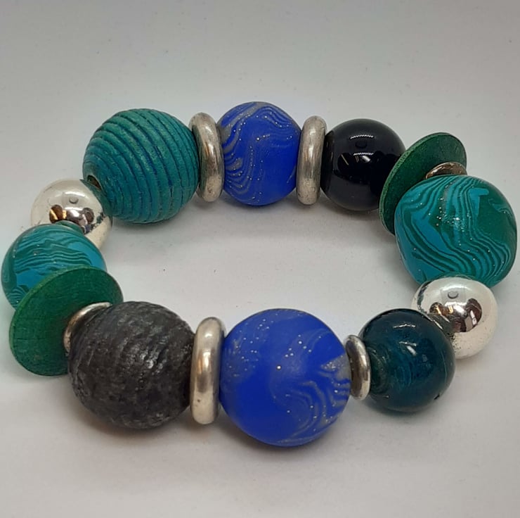 A statement bracelet featuring large handmade polymer clay beads in aqua and royal blue and sparkly silver measuring approx 18mm and 20.5mm.