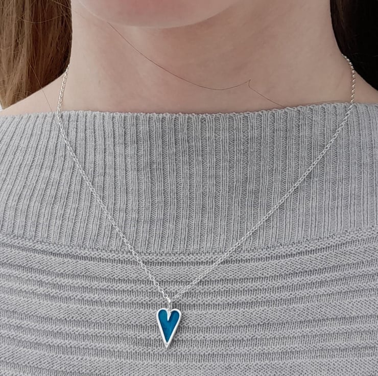 This little heart has both the cute and beauty factor. Solid sterling Silver and textured by hand behind the transparent enamel to make the light reflect. It measures 17 mm in height including the pendant bail and is 8 mm at its widest. Perfect gift for that special person. Also ideal for a child due to its dainty nature. Can be done in a variety of colours.