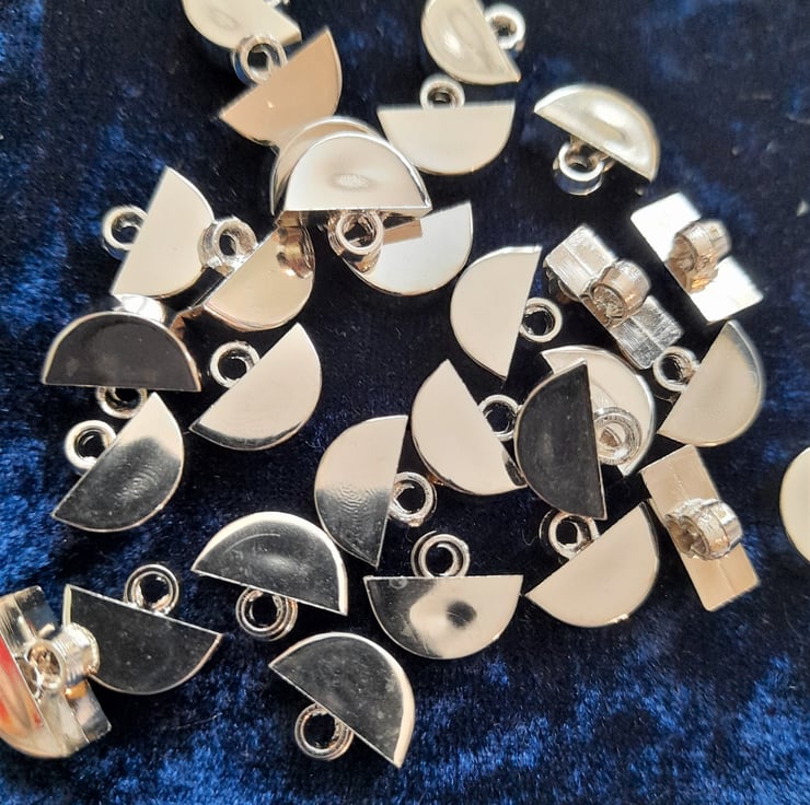 A pack of 10 buttons, 14mm / half inch in diameter, gold half moon shaped, with a back shank/loop. New. Plastic.