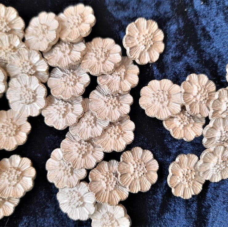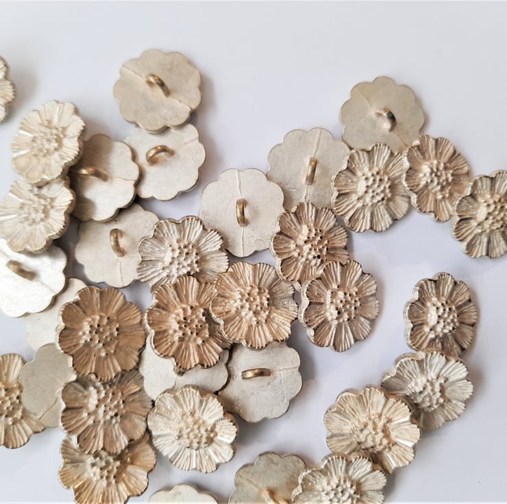 A pack of 10 buttons, Approximately 18mm in diameter, in a light gold and white colour and featuring detailed tactile flower design