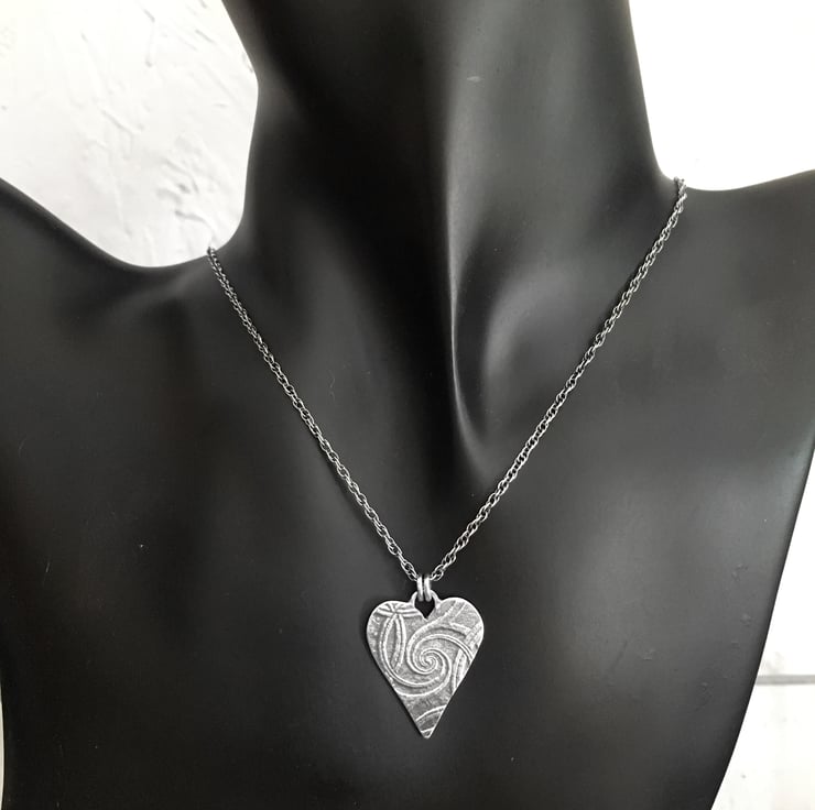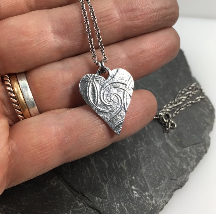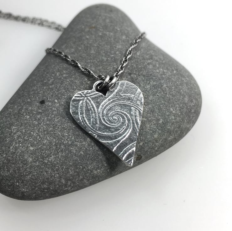 I have cut the heart from thick silver sheet, that I have embossed with a spiral pattern. It hangs centrally from a pair of little jump rings. The pendant has been oxidised dark in the recesses and buffed to a subtle shine on the high points.