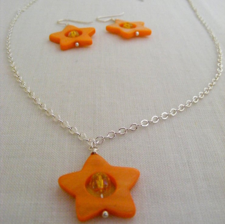 Handmade jewellery set consisting of a necklace with matching earrings. Set is made with, 22 mm orange shell stars, 6 mm lemon AB Czeck firepolish beads, silver plated chain,toggle clasp and handmade ear wires. Wire used to make ear wires is hypoallergenic and resistant to tarnishing.