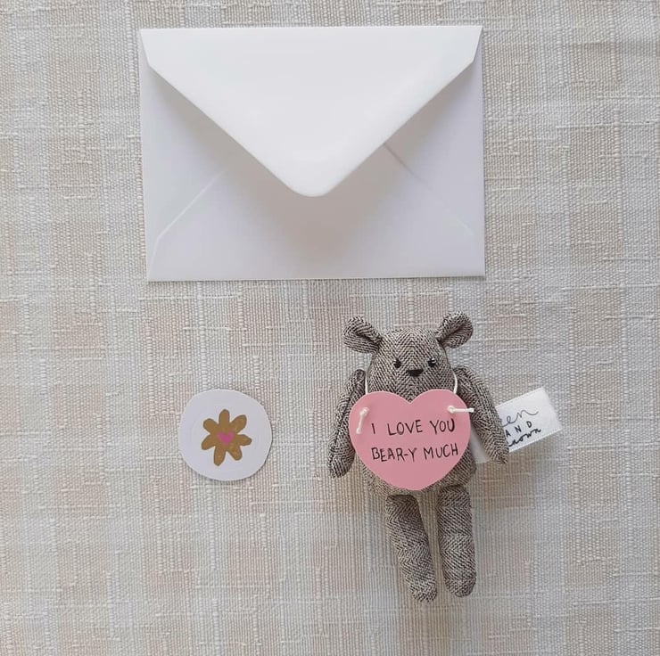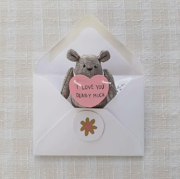 The bear is 9cm tall, with a note around his neck saying 'I love you bear-y much'.