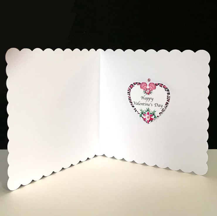 Why not choose a tropical Valentine's Card for your wife on this special day. These fabulous lilies were photographed in my garden last summer ready to feature on one of my handmade cards. To make this fashionable skin print heart even more interesting I have added some of my hand-painted shells that you will find featured on the ‘Coral Reef Thank You Cards’. This beautiful heart, Says ‘To My Darling Wife With All My Love’. It is hand-cut and mounted on a white scalloped edge card with pink and green glass gems to add a little sparkle for the special day. Inside is another smaller heart saying ‘Happy Valentines Day’
