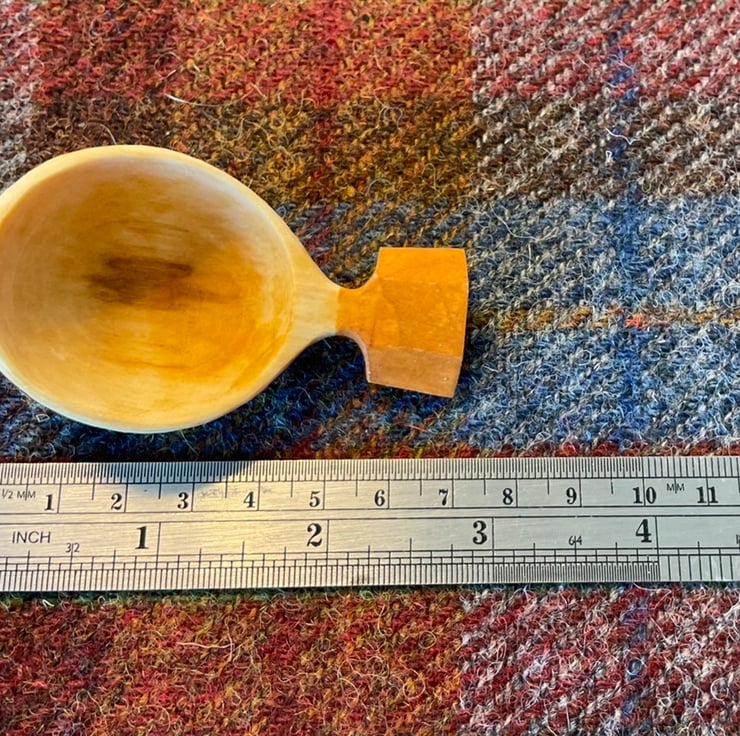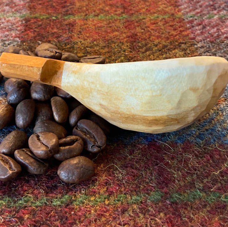 The scoop has been made from a freshly cut log, which was taken to its final shape using traditional methods- splitting the log firstly into a 'blank' using a froe tool, drawing on a rough shape before axing this out and then finalising the shape using an array of knives. This leaves beautiful cut facets which mean no sanding is required. After drying, the scoop receives a final shaping by knife, before the handle is painted using food safe milk paint and a small makers mark is burned on. The scoop is then burnished using a smooth Scottish pebble leaving a silky feeling to the wood. And finally the wood is sealed using organic food grade linseed oil.