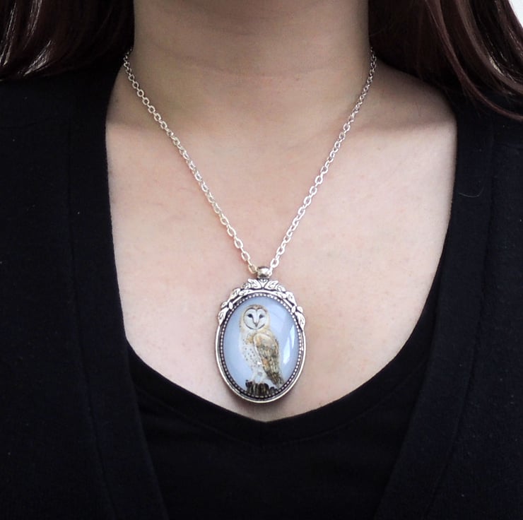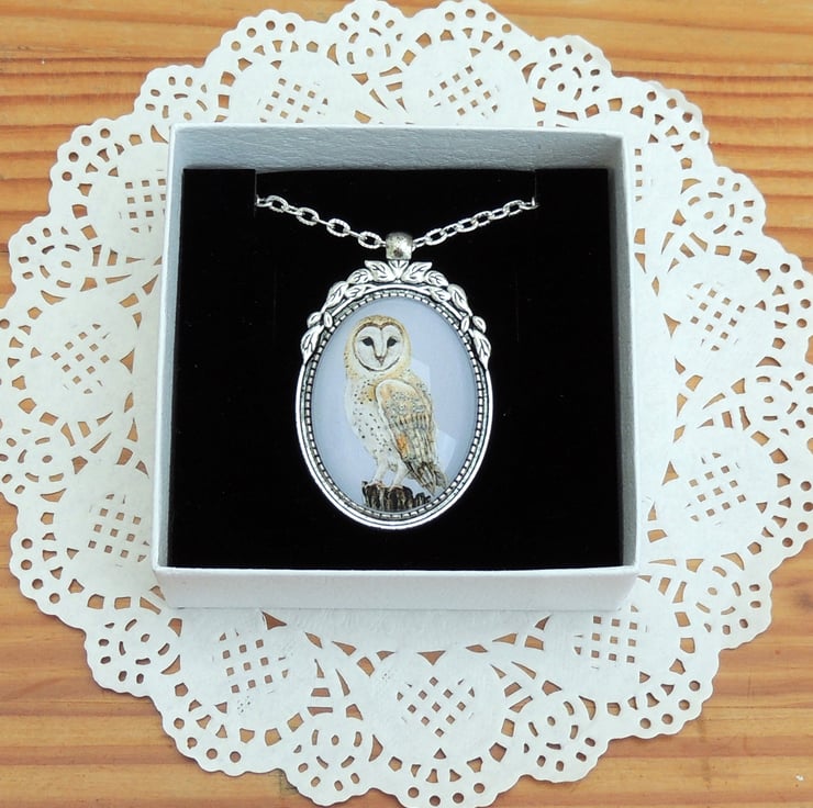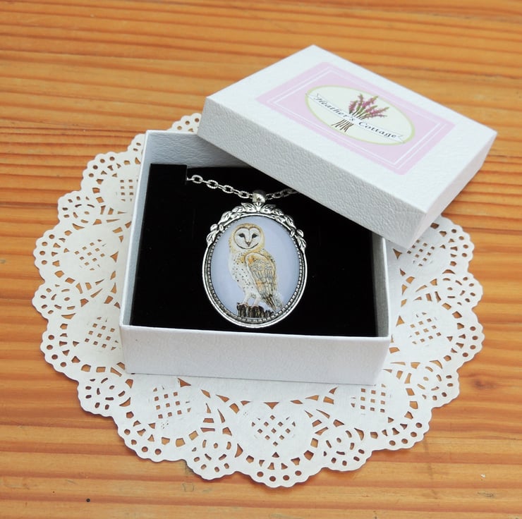 Antique silver effect necklace with a Barn Owl illustration set in a cameo style pendant with decorative leaves. Necklace comes presented in a Heather's Cottage box.