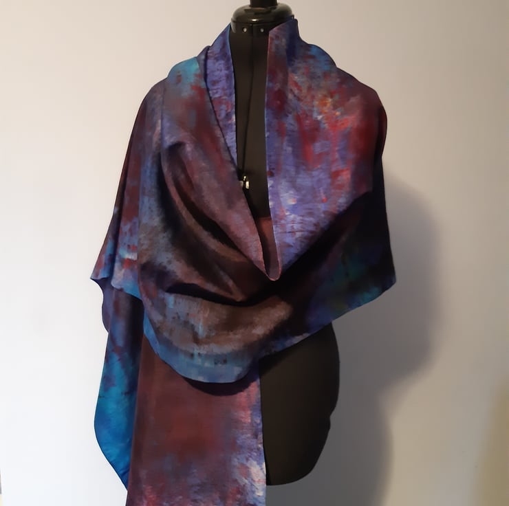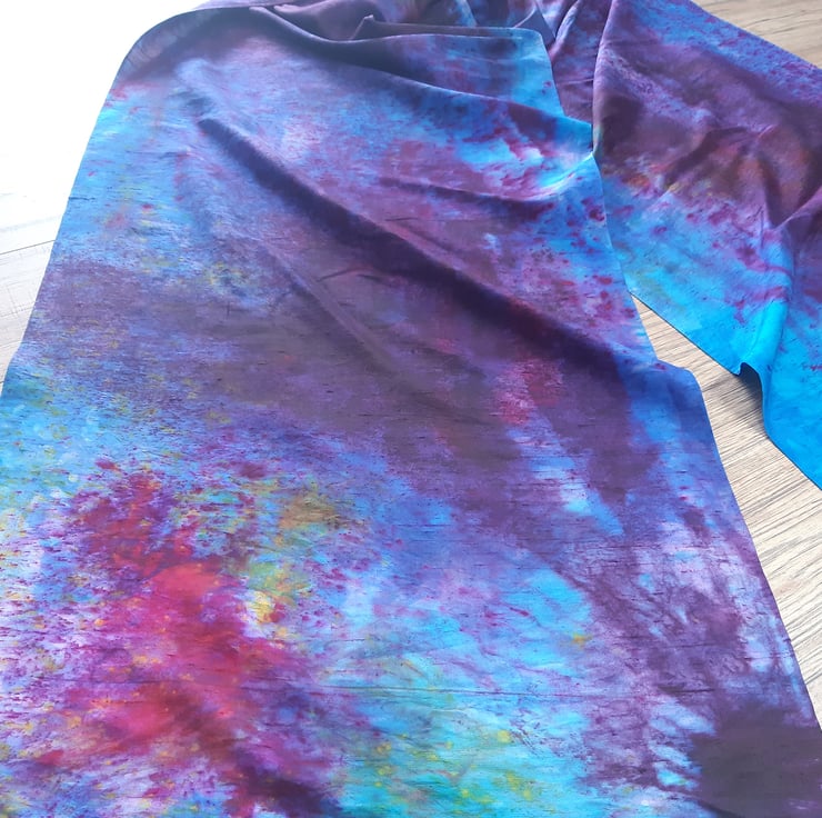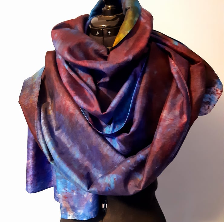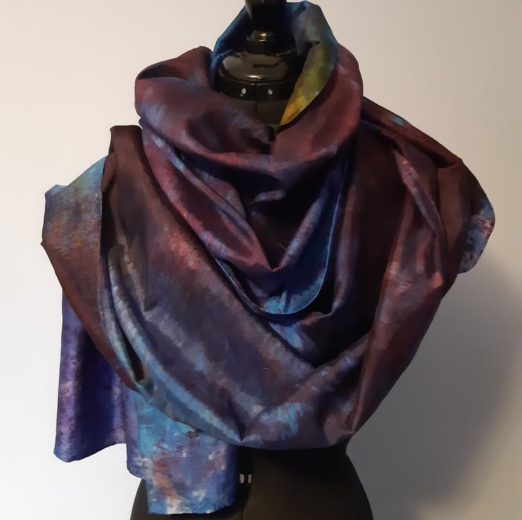 An incredibly long silk scarf, great for wrapping yourself right up in! Hand-dyed in range of complimentary shades of blues and purples, with accents of pink and a pop of yellow. Hand dyed by me in Oxfordshire, and completely unique!