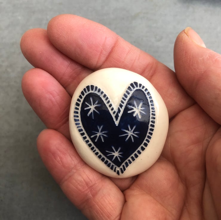 Each pebble is hand made from white earthenware clay, decorated with coloured slip and finished with a hand drawn design using the scraffito technique.