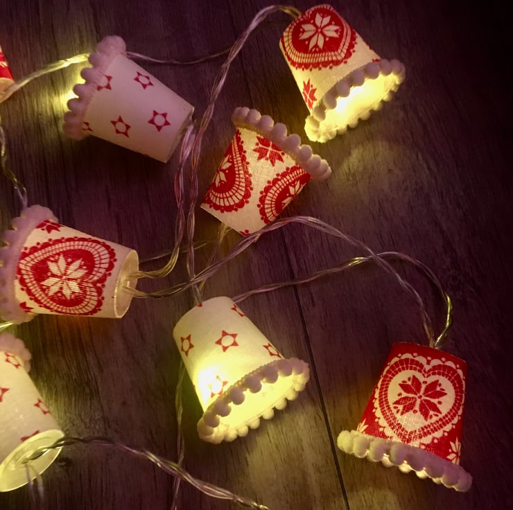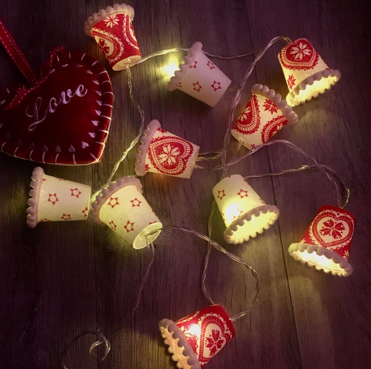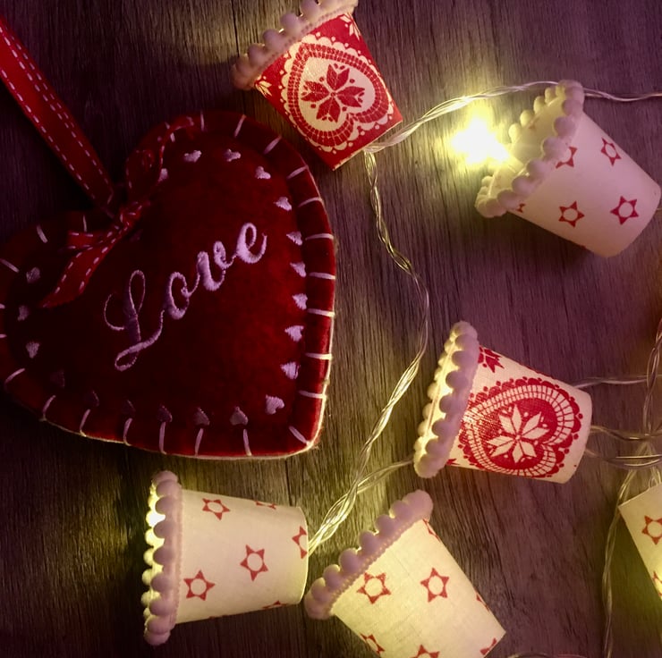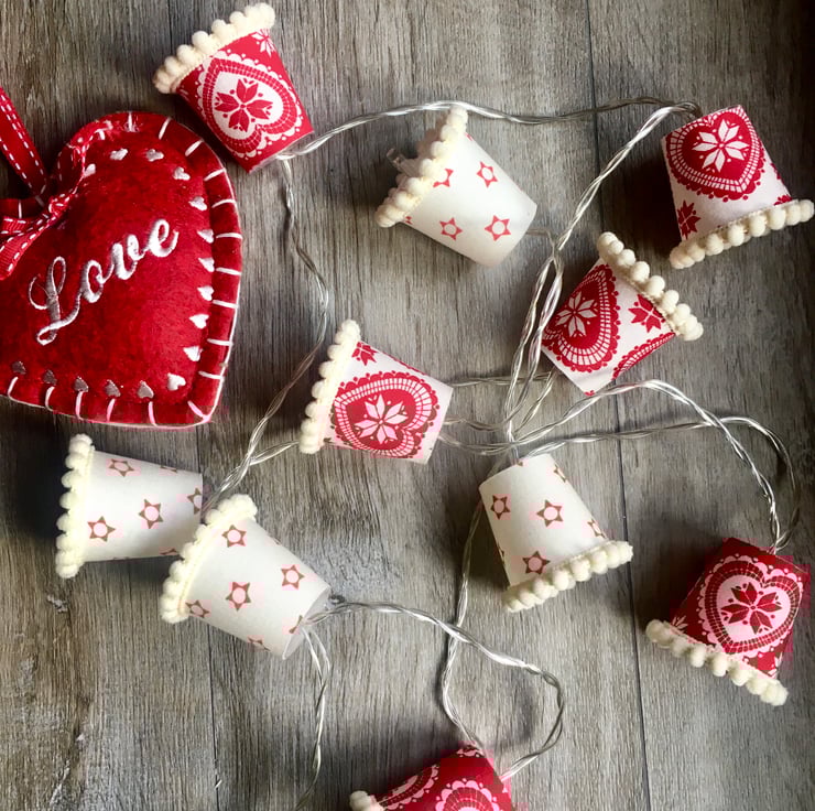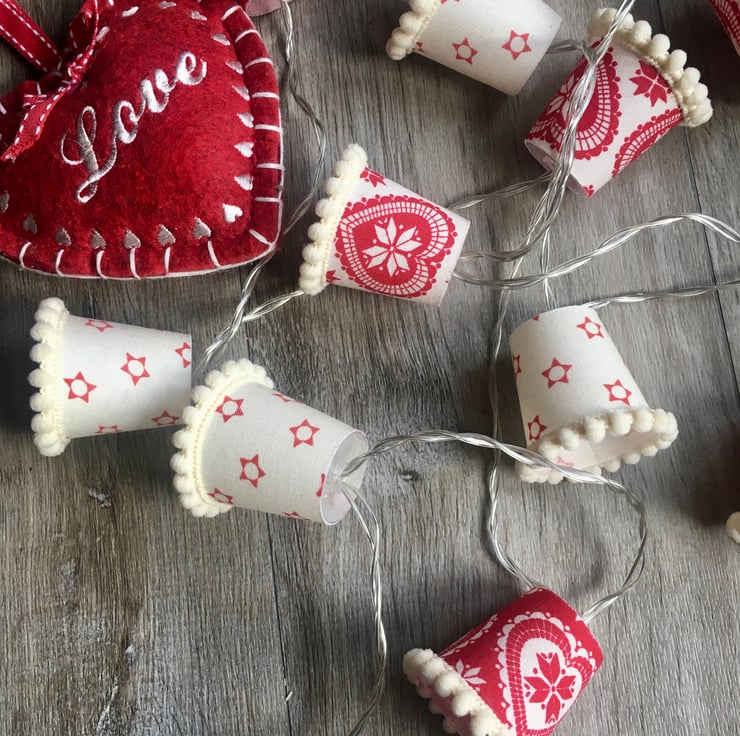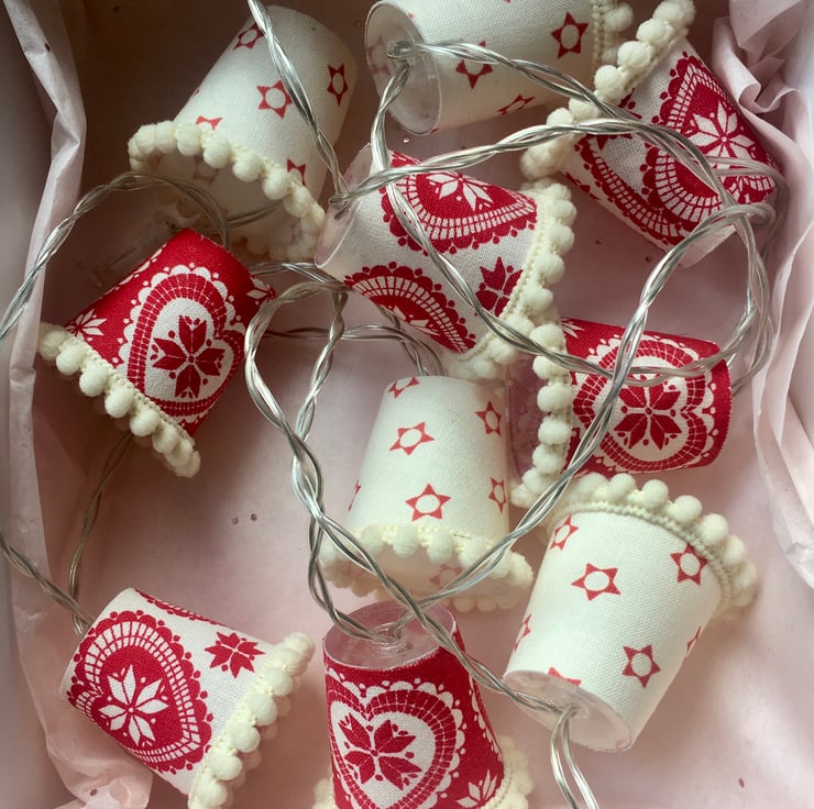 Scandi style hearts are a popular choice, and the lovely cream and red stars complements these red on cream, and cream on red hearts. A cute cream mini Pom Pom finishes each mini lampshade perfectly.