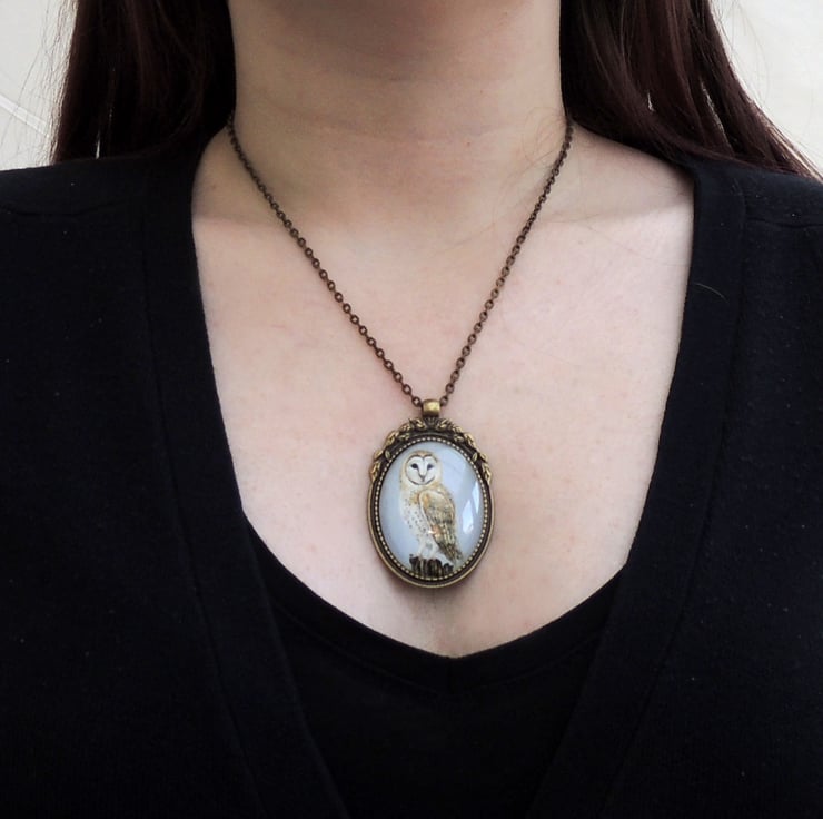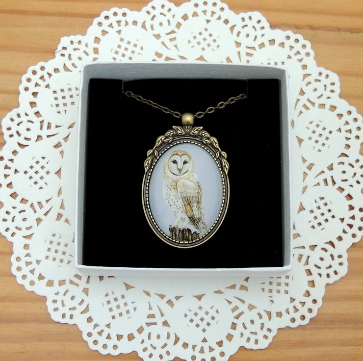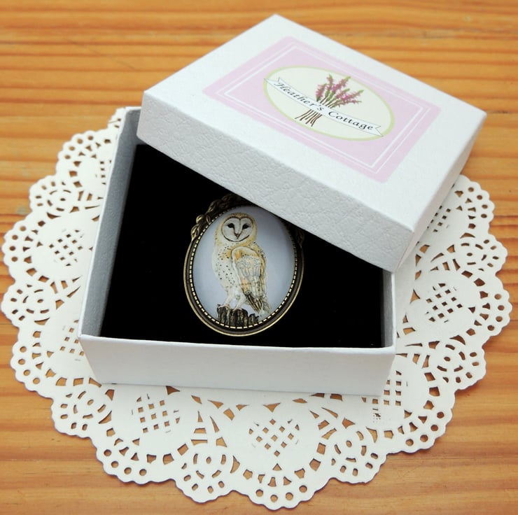 Antique bronze effect necklace with a Barn Owl illustration set in a cameo style pendant with decorative leaves. Necklace comes presented in a Heather's Cottage box.