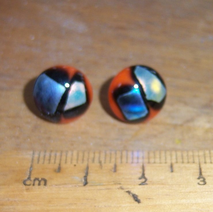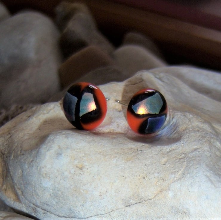 Dichroic glass fused in a microwave kiln with orange glass, to form round studs just over 1cm across. Finished with sterling silver posts and butterfly scrolls.