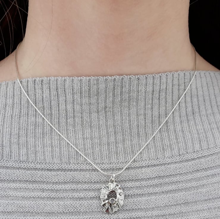 This little stunning pendant has been made from scratch out of my imagination to represent a Limpet Shell. It is not moulded from a shell.. It is delicate but yet has a solid feel. It's been oxidised to enhance the texture and is set with a Blue Topaz (4 mm) It measures 20 mm in height and comes on a 17" Belcher chain,. Please specify at checkout if another length chain is preferred.. As these are individually made there will be slight differences in them but the basic size will be the same approximately .